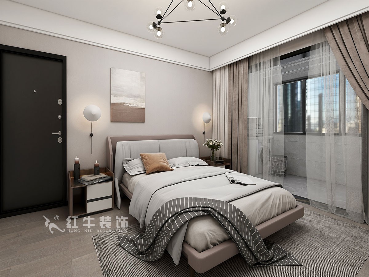 此案主要是婚房居住,在舒適度上要求比較高,臥室是整套房子中最私人也是最體現(xiàn)出溫馨休閑感的空間,在設(shè)計時體現(xiàn)出靜謐舒適的感覺,并且與其他空間明顯的區(qū)別,利用書房厚度開洞口,把電視掛墻上,把冰箱嵌入,更好的布局。這樣舒適度更好,區(qū)域劃分明顯,動靜分離。吊頂簡潔大氣,配以輕現(xiàn)代家具,完美闡釋了簡約風(fēng)格。整體現(xiàn)代簡約風(fēng)格的設(shè)計,搭配上顯眼的綠色植物讓整個空間呈現(xiàn)出一種生機勃勃的自然美。
