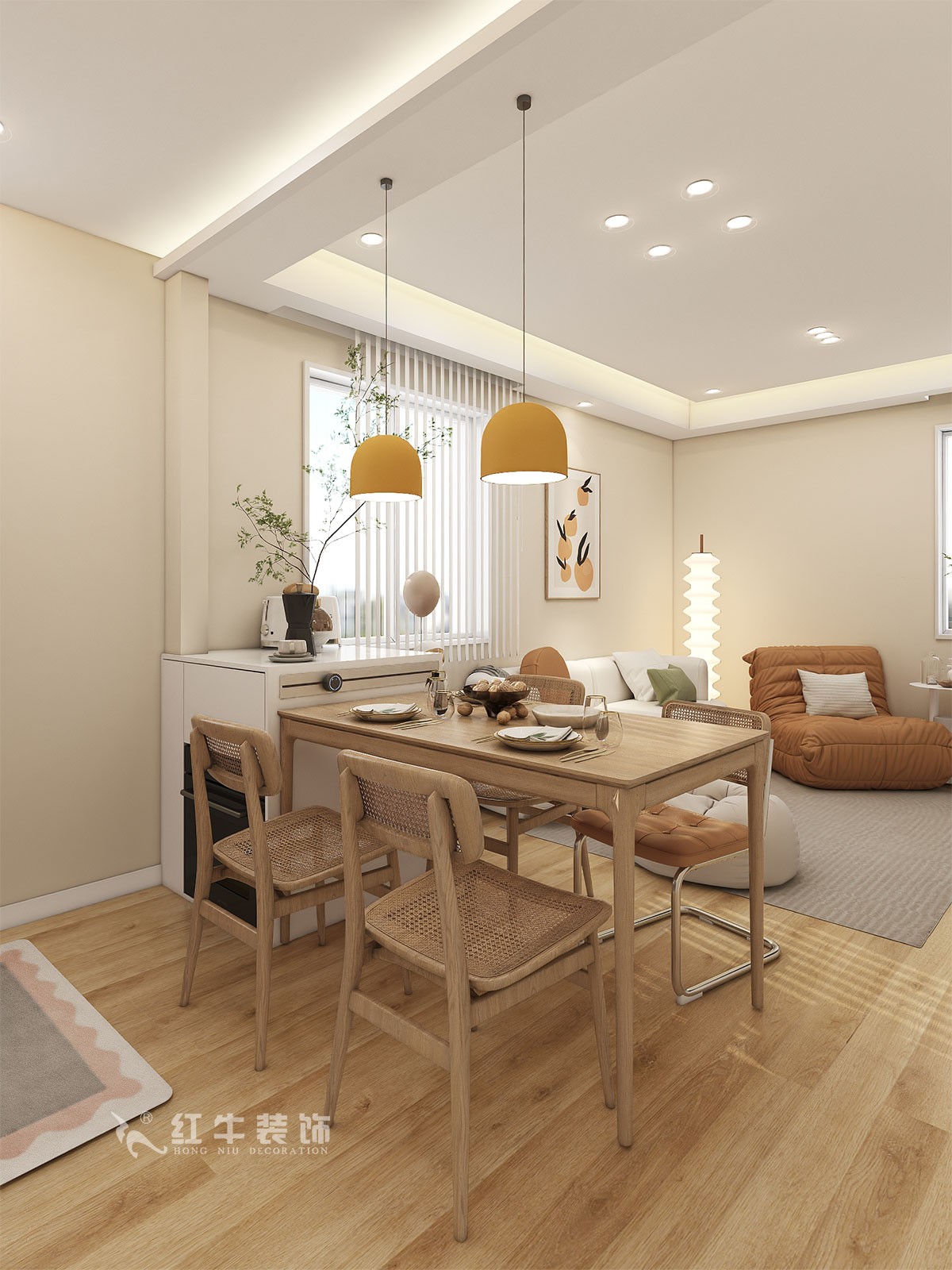 入戶門廳增加鞋柜,增加入戶儲藏??蛷d的搭配以定制的原木收納柜為主,格局之內(nèi)都采用天然木質(zhì)家具,最柔和的顏色,最真實的紋理,搭配球形吊燈,打造出舒適優(yōu)雅的就餐環(huán)境。當(dāng)奶油色的純凈與灰色的安逸相遇,空間迸發(fā)出柔和溫暖的氣息,恰到好處地構(gòu)建出治愈、舒適的家居氛圍。