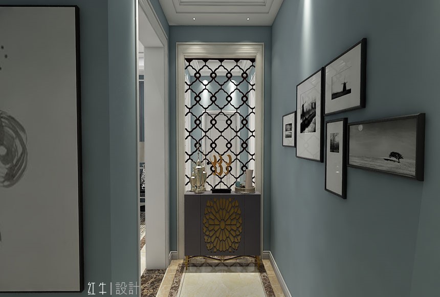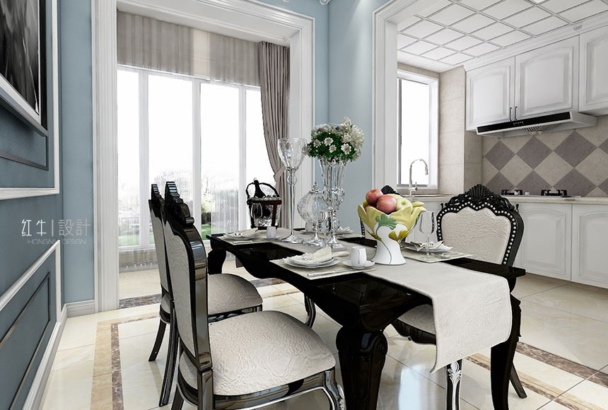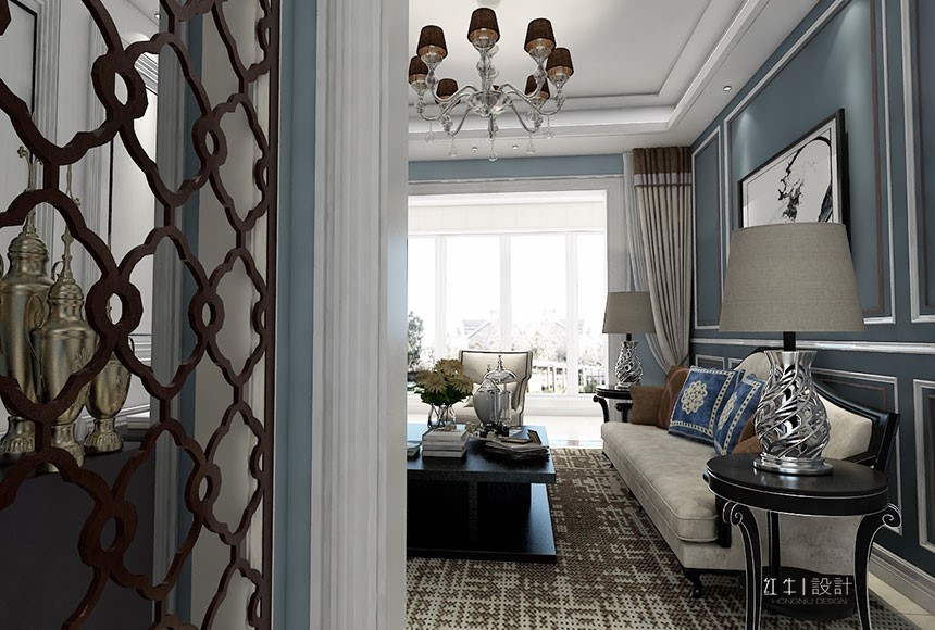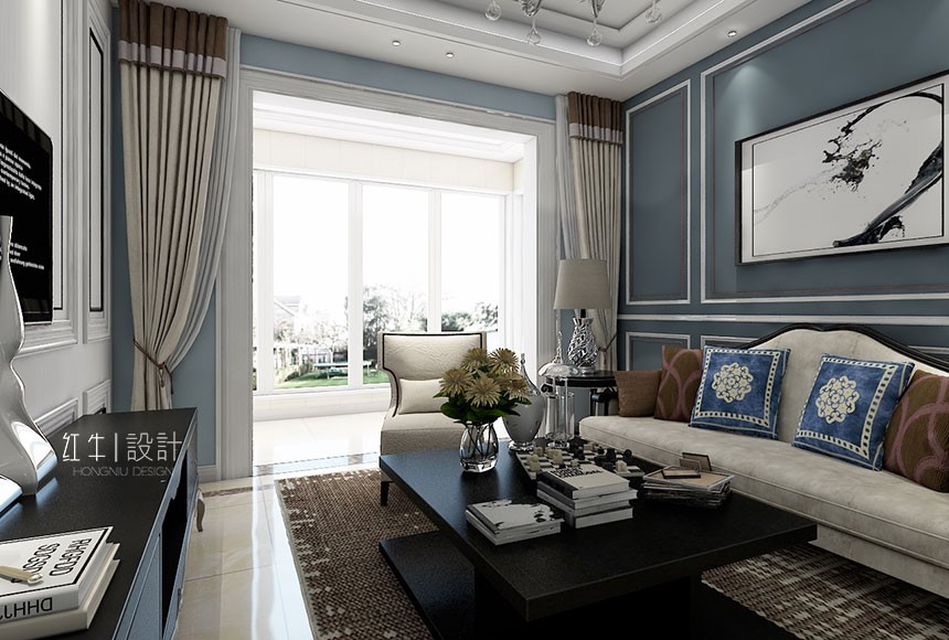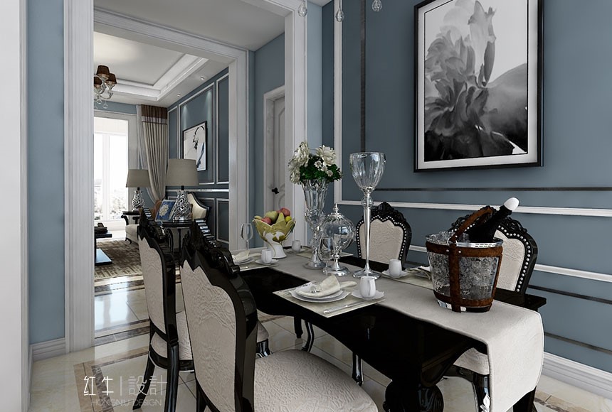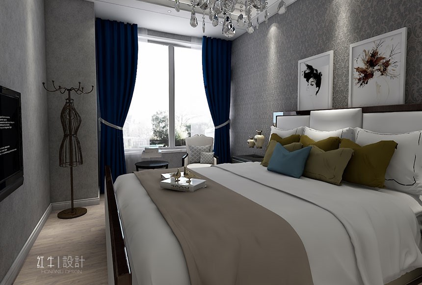 此戶型考慮現(xiàn)代簡歐風(fēng)格,主體顏色以藍(lán)色為主,搭配深淺家具,表
