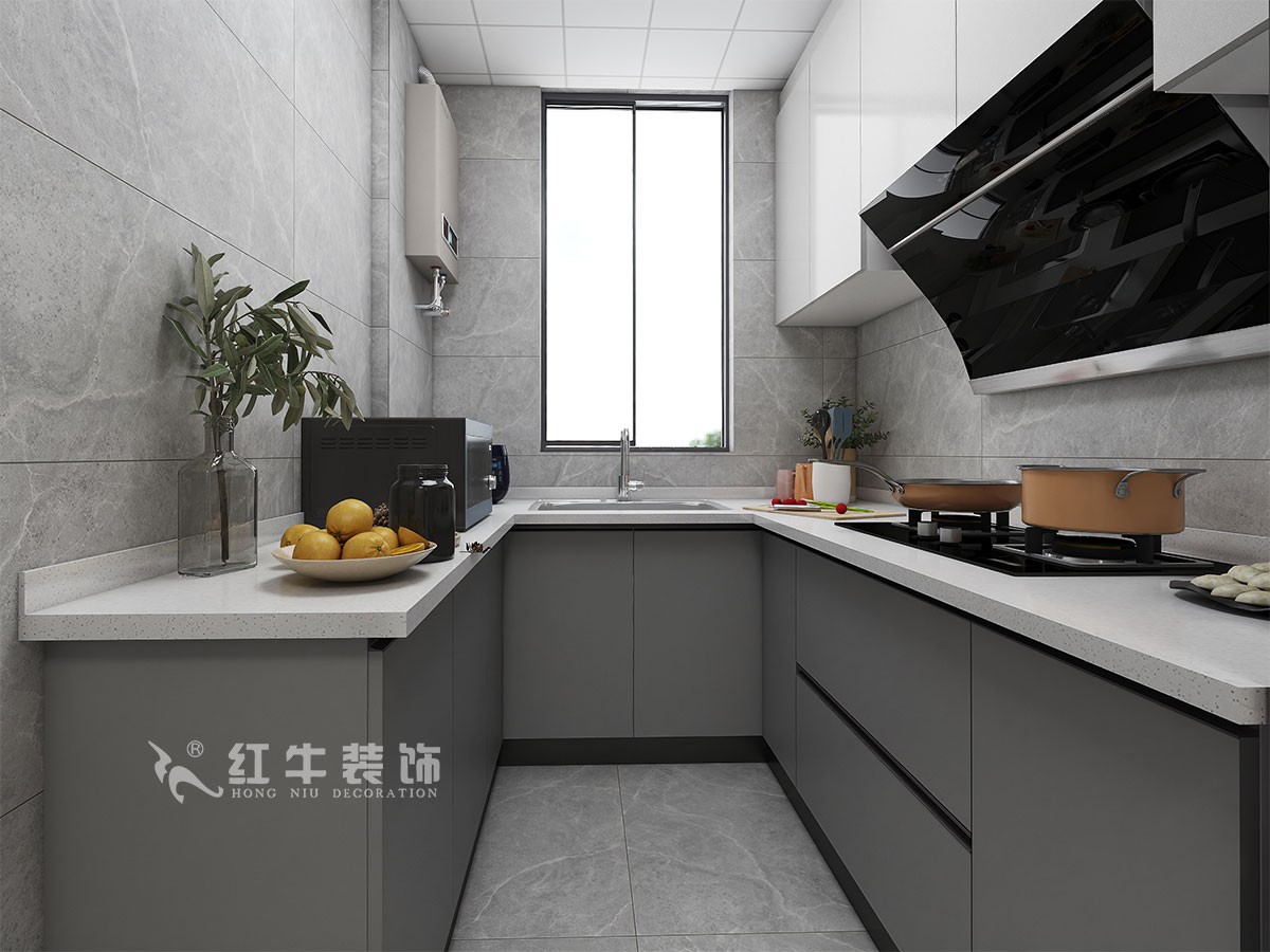 U字型廚柜,冰箱放置廚房,使用方便,客廳和陽臺合二為一,極大了方便了業(yè)主的生活。所以,設計色彩上是以明快、簡潔為主。