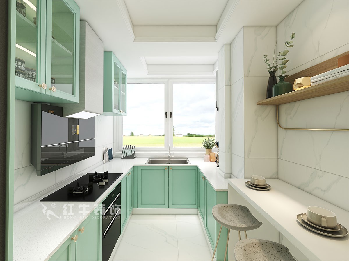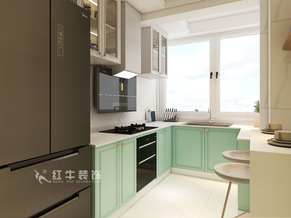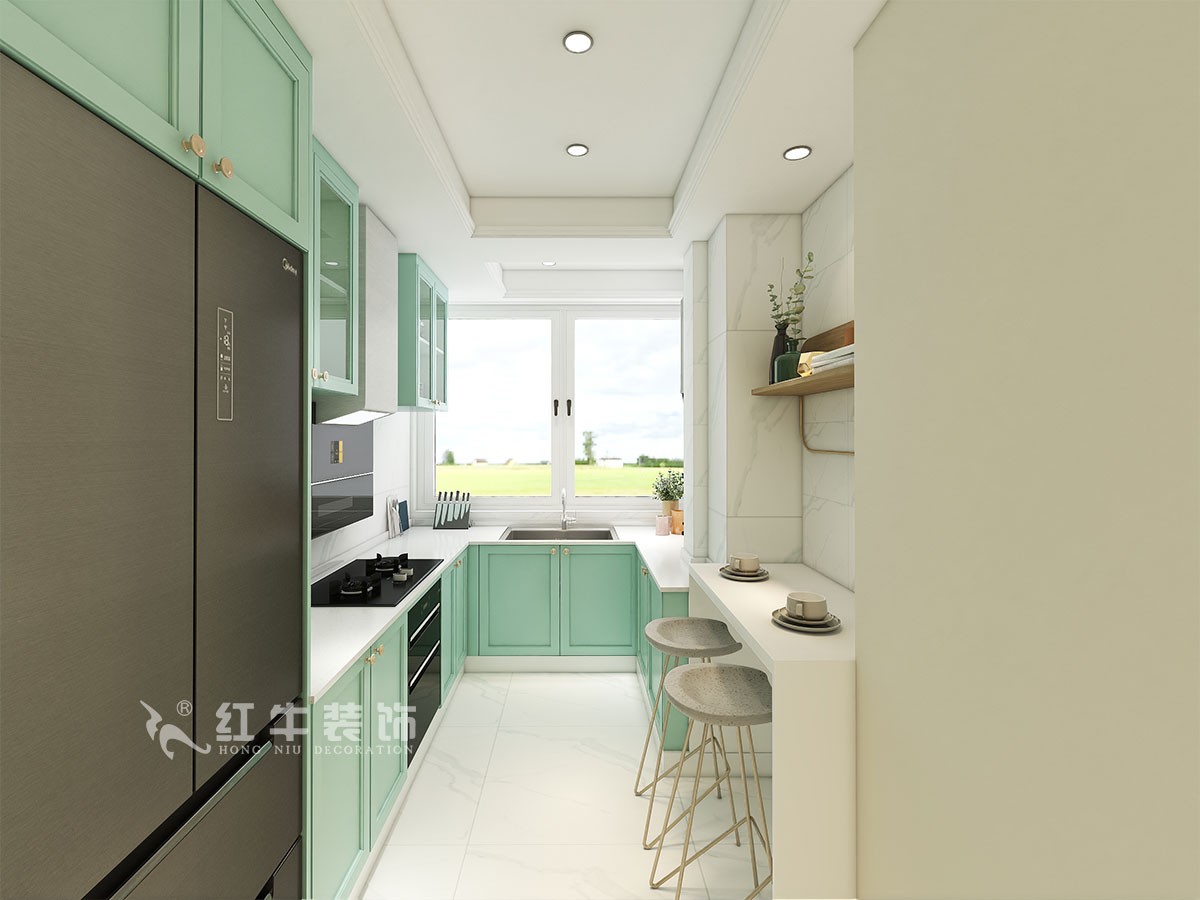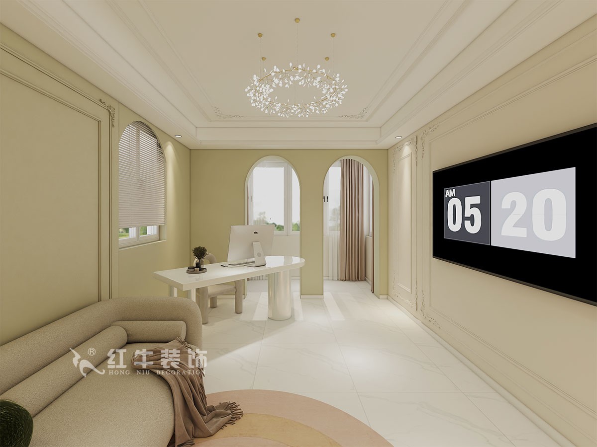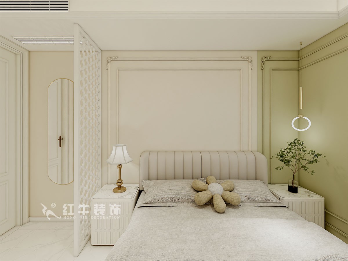 本案是本案客戶女兒回國(guó)臨時(shí)居住,以法式奶油風(fēng)定義,網(wǎng)紅牛油果綠加上汝窯色,調(diào)節(jié)出歡快溫馨的效果,頂墻面線條增加立體層次感,設(shè)計(jì)上背景采用牛油果綠加上暖色的搭配,使空間看起來(lái)溫馨自然,利用原結(jié)構(gòu)的特點(diǎn)制作出三個(gè)圓弧,交相呼應(yīng)。