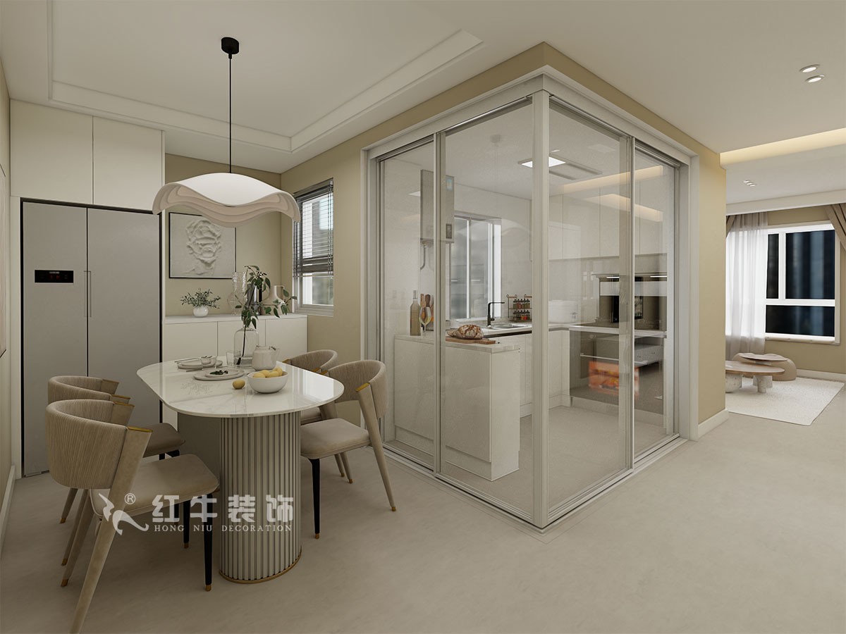 結構改動較大,通過溝通,舍棄一個房間做了餐廳,增加一個衣帽間的空間,廚房半敞開式,整個空間全部打開,非常舒適。