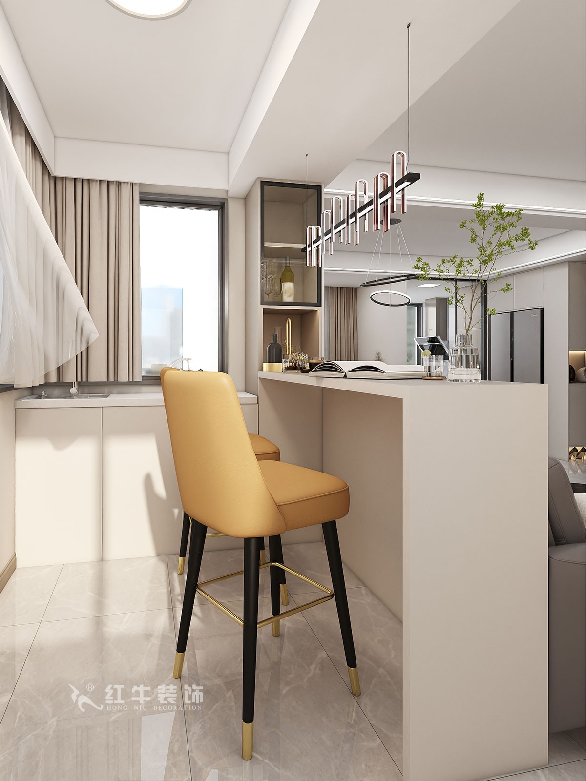 沙發(fā)在整個區(qū)域沒地方擺放,而是設(shè)計了吧臺充當(dāng)墻體,讓沙發(fā)有靠山,漂亮的吧臺是一個亮點,又能起到分割空間的作用。廚房窗戶比較大光線就能更好的進(jìn)到門廳,衛(wèi)生間也能單獨一個區(qū)域。