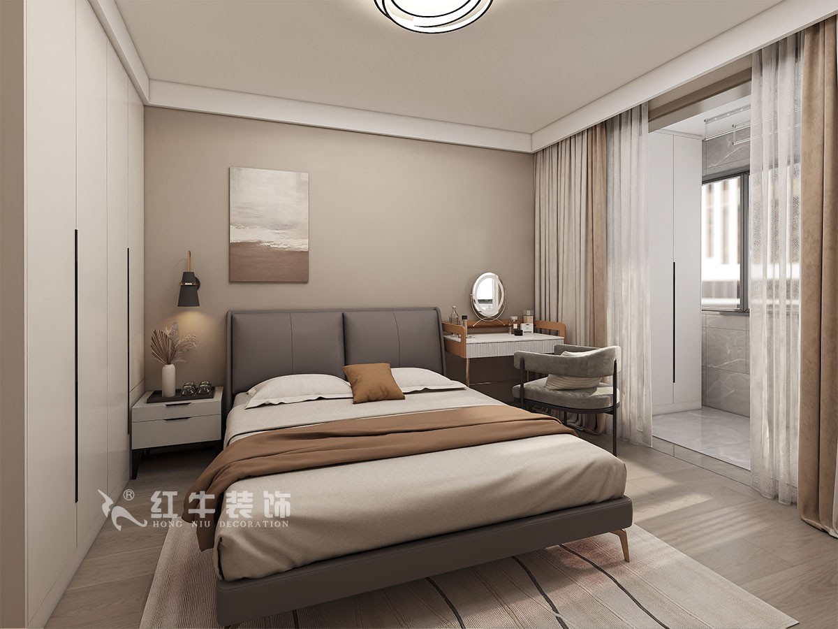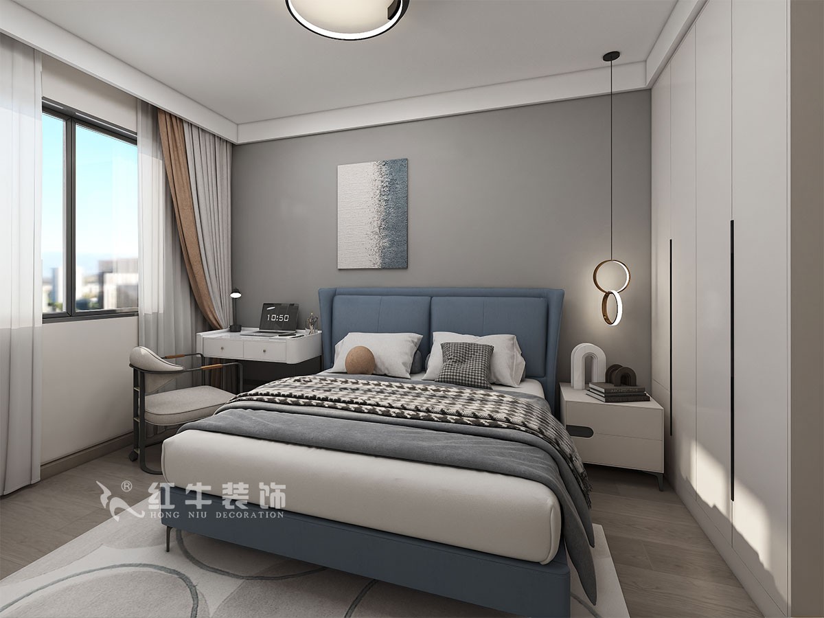 此案主要是婚房裝修,在舒適度上要求比較高,臥室是整套房子中最私人也是最體現(xiàn)出溫馨休閑感的空間,在設(shè)計時體現(xiàn)出靜謐舒適的感覺,并且與其他空間明顯的區(qū)別。