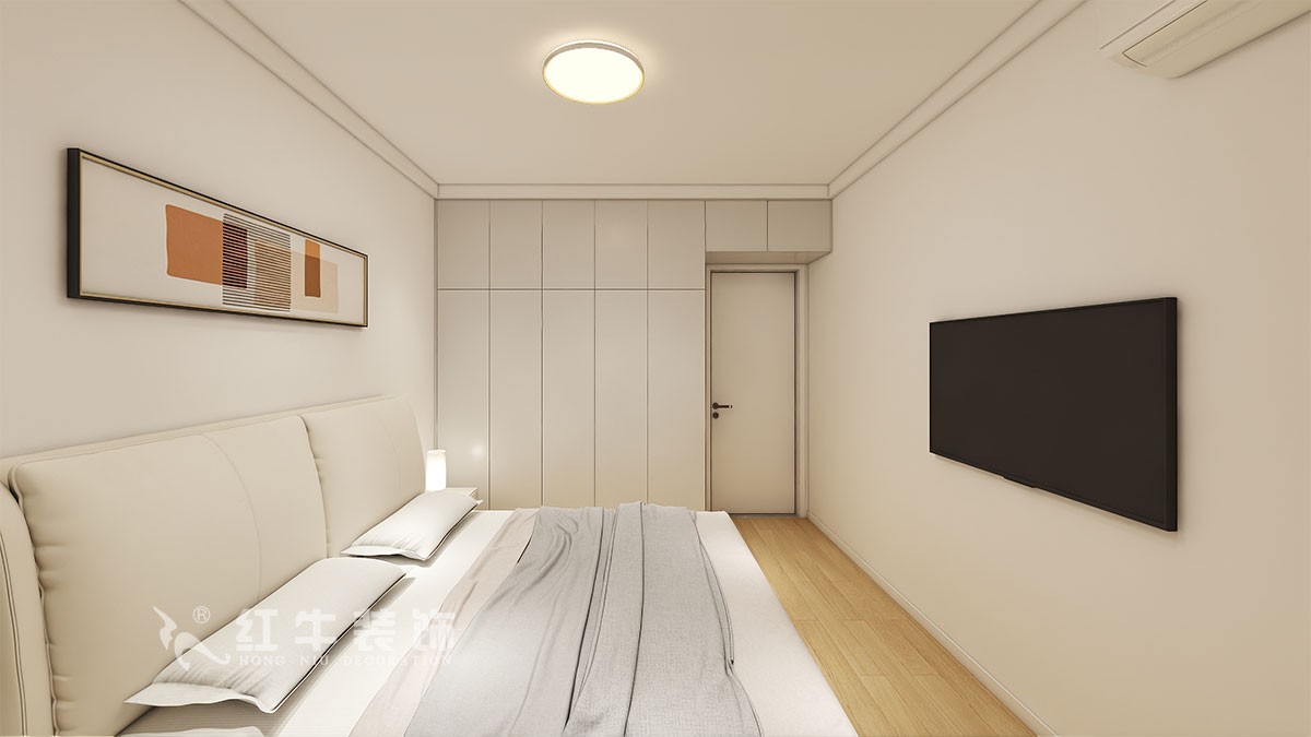 臥室單眼皮吊頂設(shè)計(jì)使空間更加不壓抑,白灰色色色大床更適合兩人的居住需求和觀感,和奶茶色的柜子相得益渣。整個(gè)空間色調(diào)溫和的,很適合臥室的氛圍感。