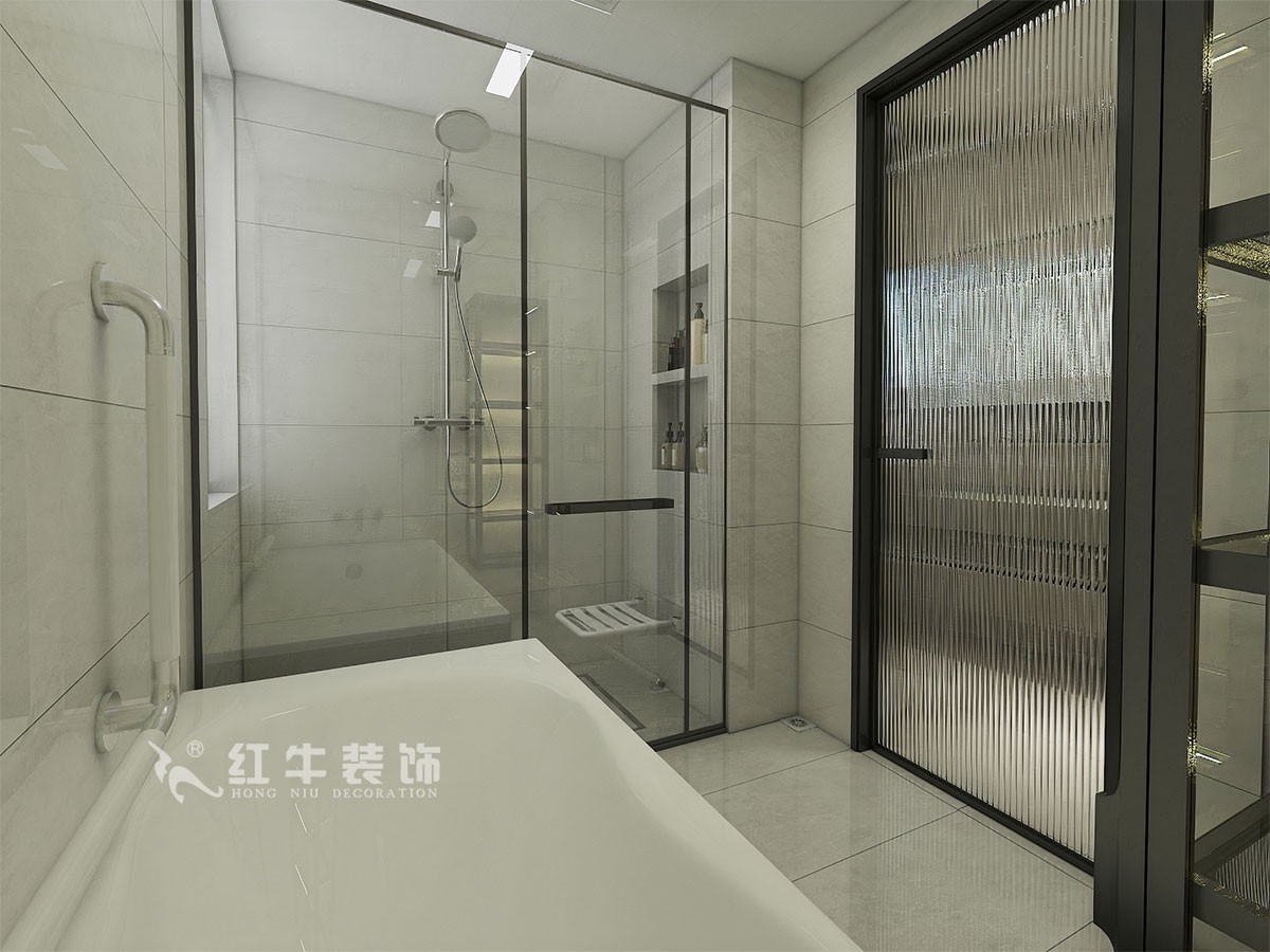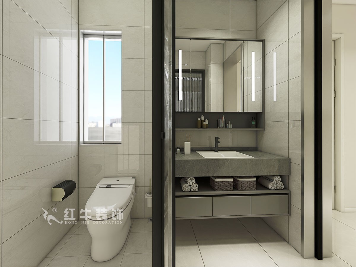 2、衛(wèi)生間的設(shè)計是把兩個衛(wèi)生間的部分面積合并了一個三分區(qū)的衛(wèi)生間,而且再干區(qū)的位置做了一個口袋門的隱形門設(shè)計,這樣的衛(wèi)生間又是一個整體。
