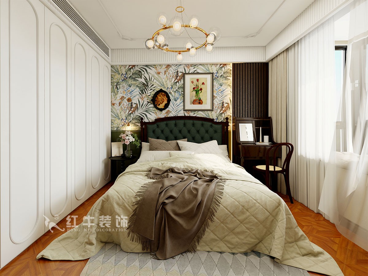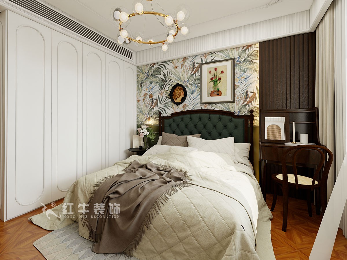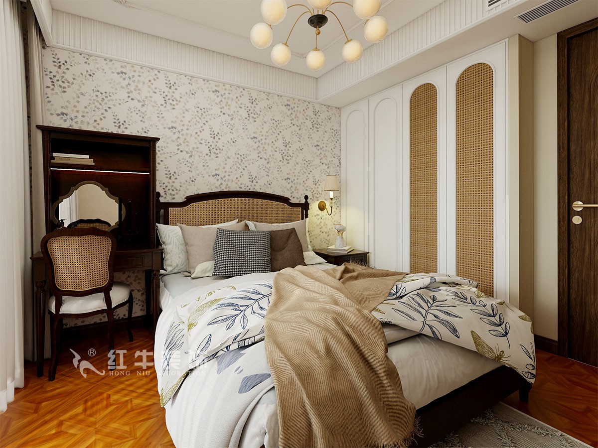 復(fù)古文藝的黃銅吊燈搭配古樸自然的壁燈,高雅素凈,給臥室?guī)砹烁釉娨獾姆諊?,增添了生活的情趣。古樸精致的床頭柜加上了藤編的元素,心情都變得平穩(wěn)寧靜。