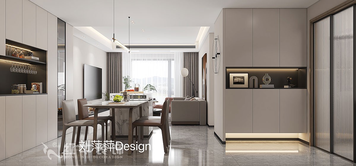 業(yè)主是一對(duì)小年輕,作為婚房使用,廚房和衛(wèi)生間進(jìn)行了墻體改造,這樣空間更加合理,利用率也比較高。主衛(wèi)改成了衣帽間,考慮兩房?jī)蓚€(gè)衛(wèi)生間沒(méi)有必要,客戶(hù)正好對(duì)儲(chǔ)物要求比較高。餐廳區(qū)域比較大,做了餐邊柜和鞋柜+餐桌島臺(tái)的設(shè)計(jì),不僅滿(mǎn)足了儲(chǔ)物的需求,同時(shí)也使得空間更加豐滿(mǎn)、大氣、時(shí)尚。