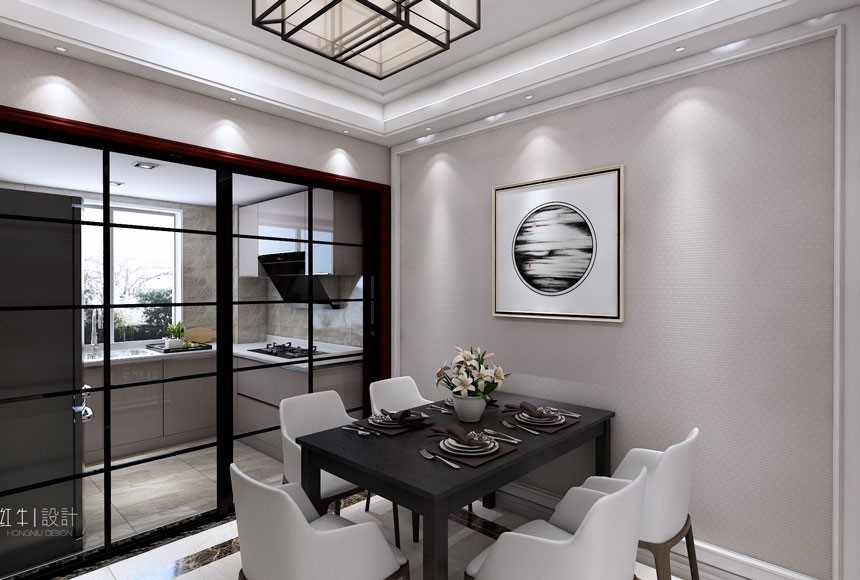 餐廳與廚房之間使用玻璃進(jìn)行隔斷,使得空間通透,采光良好。餐廳這小小空間里,隨處可見的線條元素,打造出簡(jiǎn)潔明快的視覺效果。