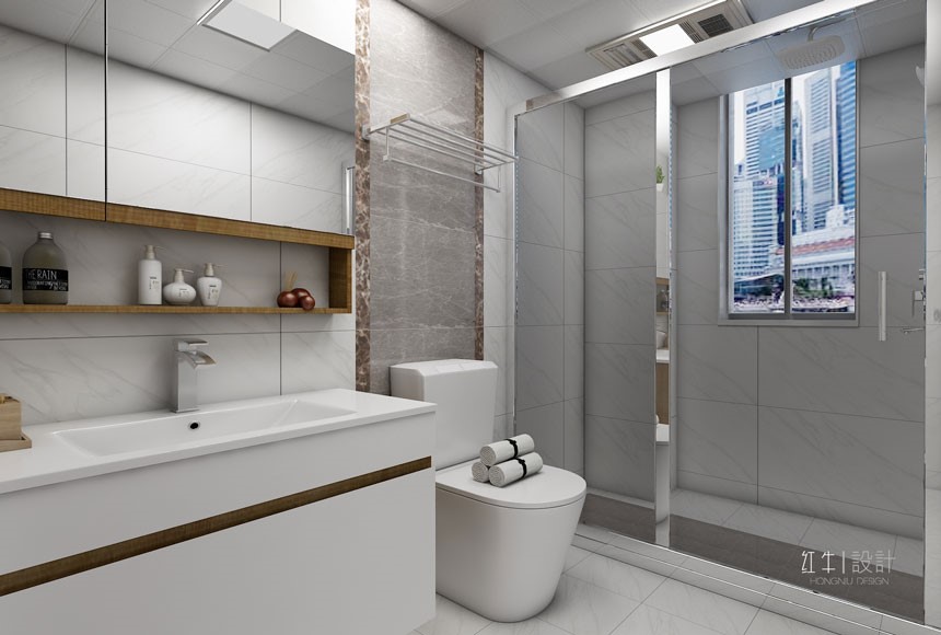 主臥還配備了衛(wèi)生間,整體來看非常簡(jiǎn)潔,但從設(shè)計(jì)來看,卻是實(shí)用又美觀,比如洗手臺(tái)上安裝的鏡柜,既可用于儲(chǔ)物,又可用做大鏡子,使浴室顯得明亮又寬敞。