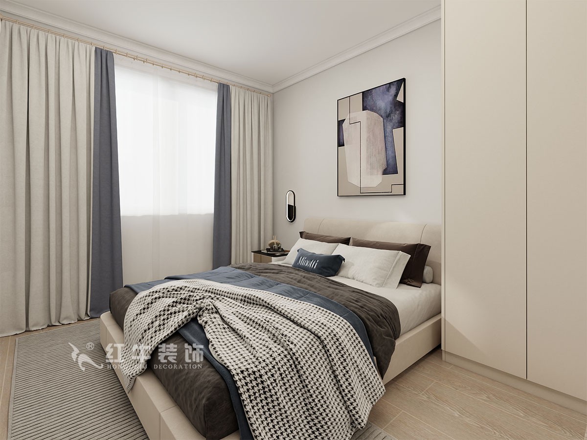 此案主要是婚房裝修,在舒適度上要求比較高,臥室是整套房子中最私人也是最體現(xiàn)出溫馨休閑感的空間,在設(shè)計時體現(xiàn)出靜謐舒適的感覺,并且與其他空間有明顯的區(qū)別。