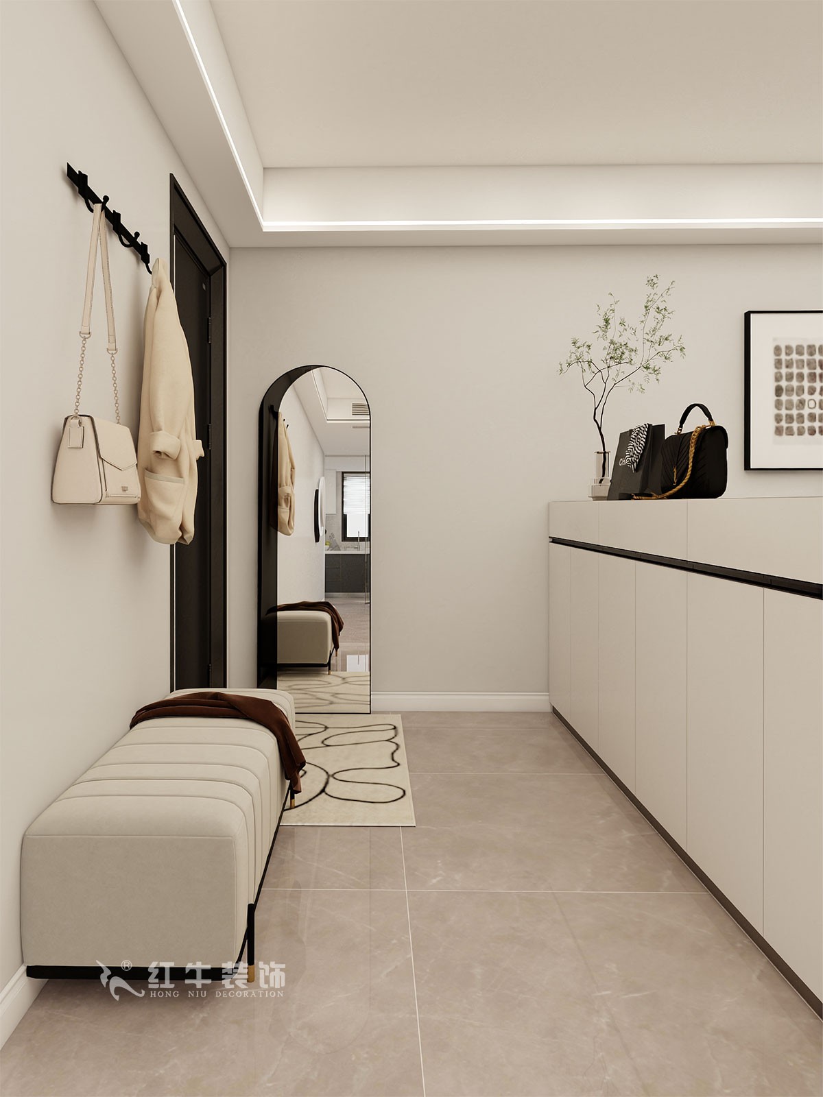 入戶一字形鞋柜,暖白色門板為主色調(diào),黑色作為點(diǎn)綴,干凈清爽,融入掛衣鉤、換鞋凳、穿衣鏡等設(shè)計(jì)。