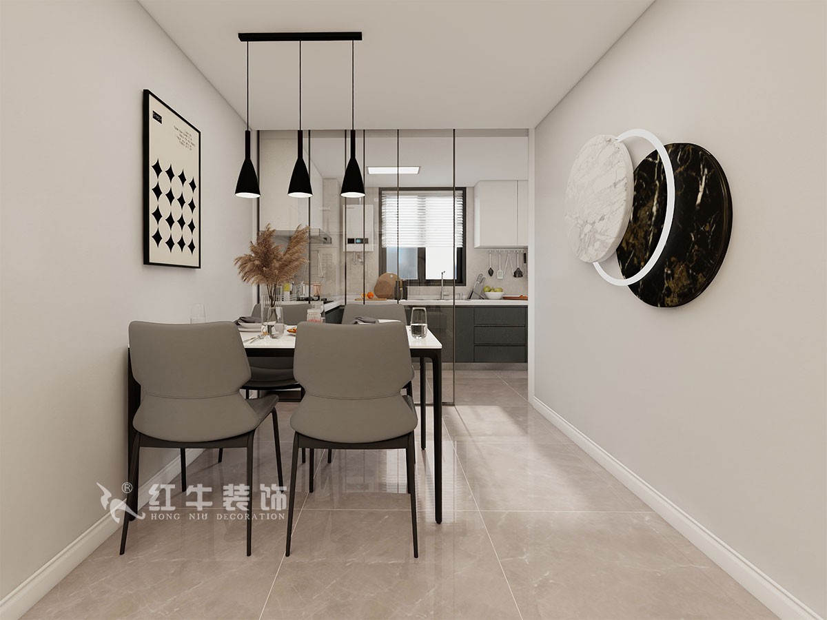 餐廳延續(xù)了整體的設(shè)計(jì)風(fēng)格和色調(diào),白色巖板方桌,灰色皮藝餐椅、裝飾畫、燈具等,使用餐氛圍充滿儀式感。