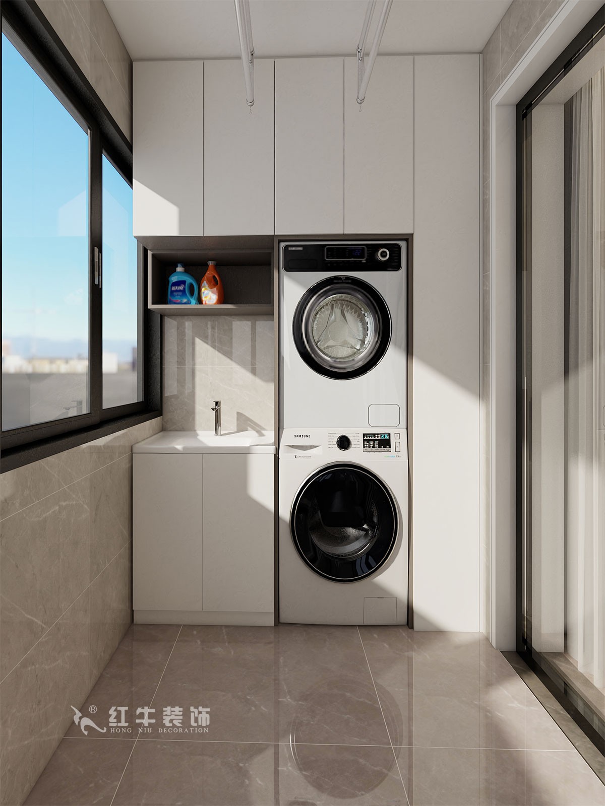 置頂式陽臺柜與開放式設(shè)計(jì)進(jìn)行收納儲物,嵌入式洗烘設(shè)備、洗衣臺盆,解決了日常所需,又給空間增加了些許層次。