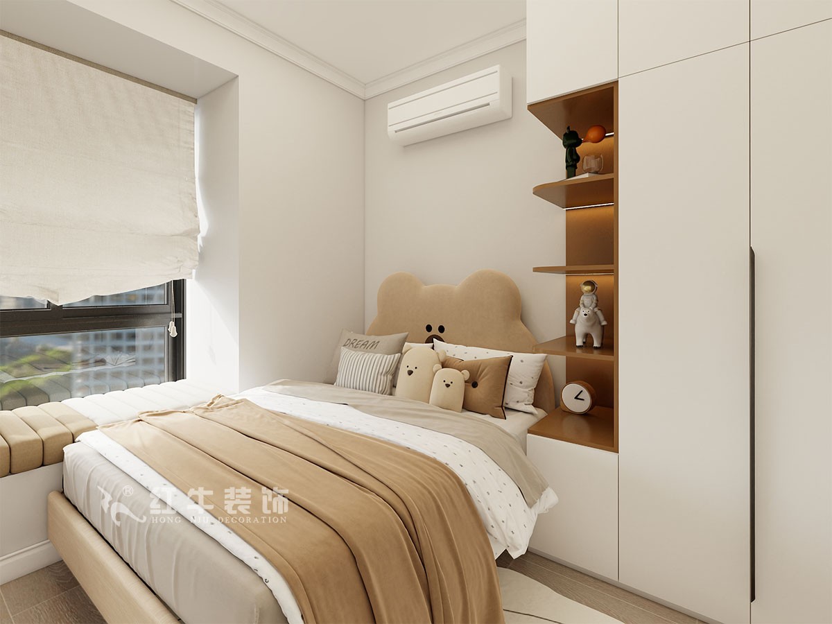主臥以白灰為基調(diào),床頭背景墻用抽象的藝術(shù)畫進(jìn)行裝飾,灰色飾面、軟包床頭,床品與原木色地板仿佛融為一體,使空間更加簡潔、時尚。