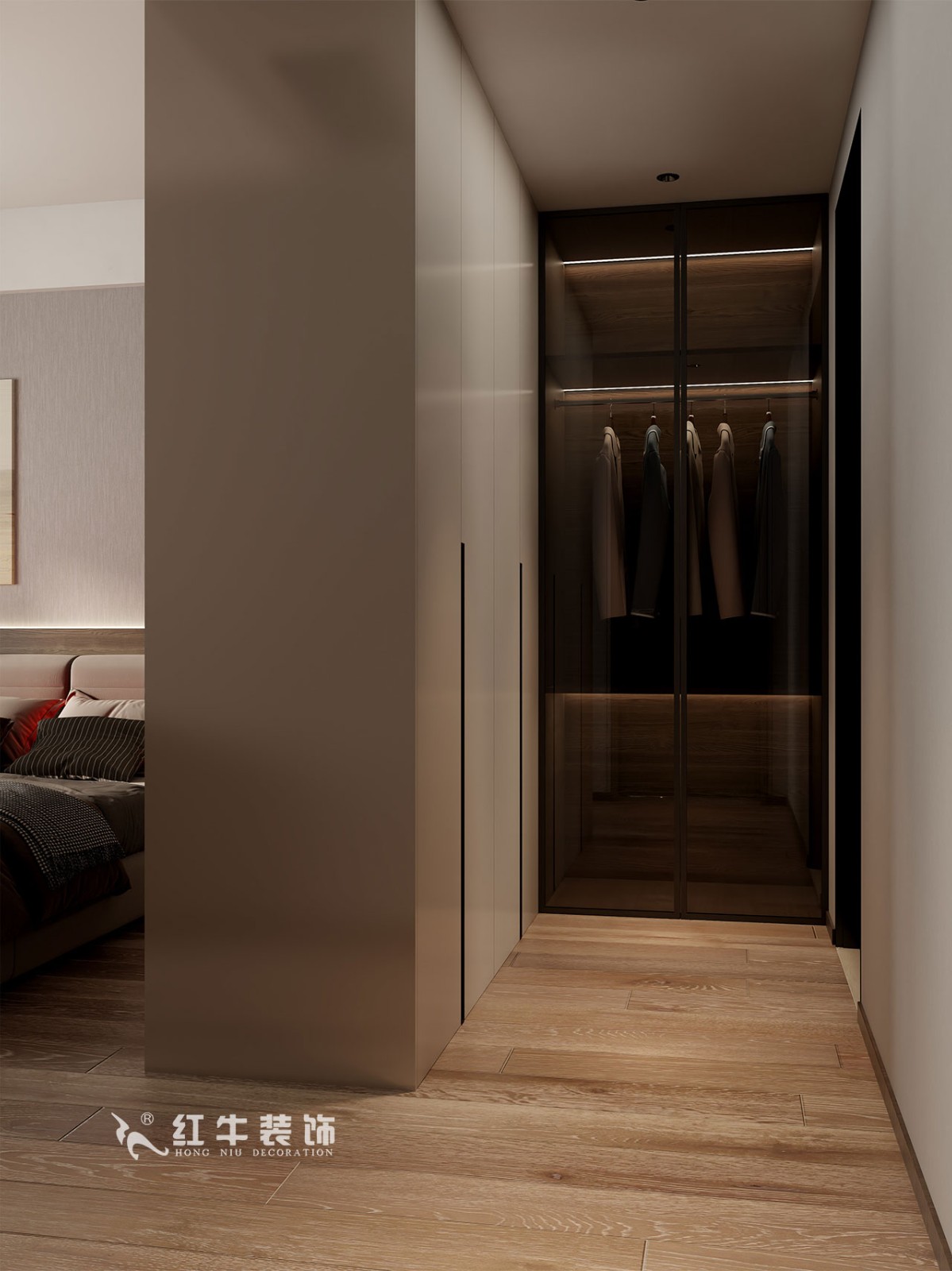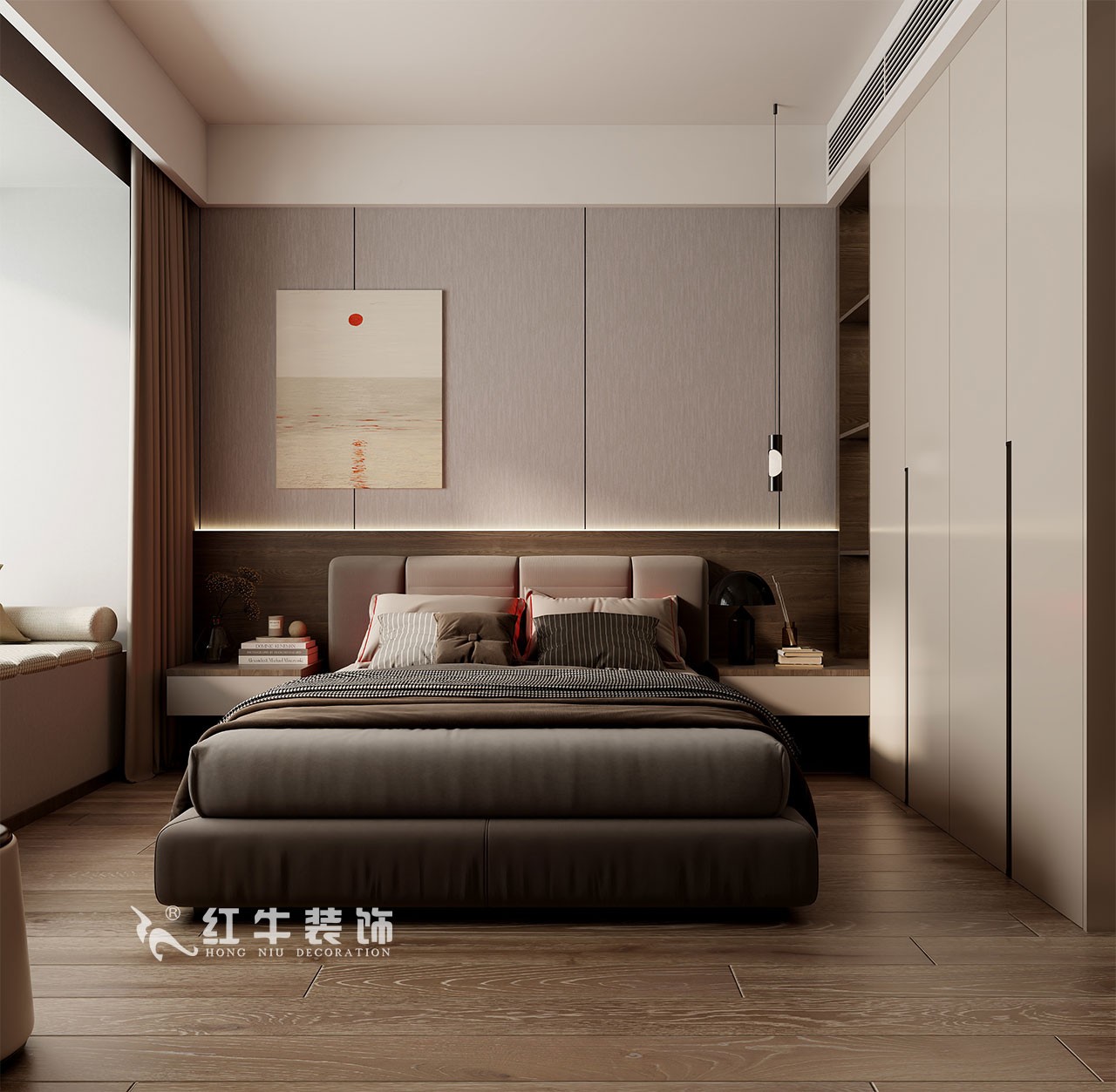 主臥無(wú)主燈設(shè)計(jì),搭配床頭燈帶與吊燈,多光源滿足不同需求。延續(xù)整體空間的色調(diào),低飽和度色系搭配木地板,營(yíng)造溫馨舒適、優(yōu)雅的睡眠空間。