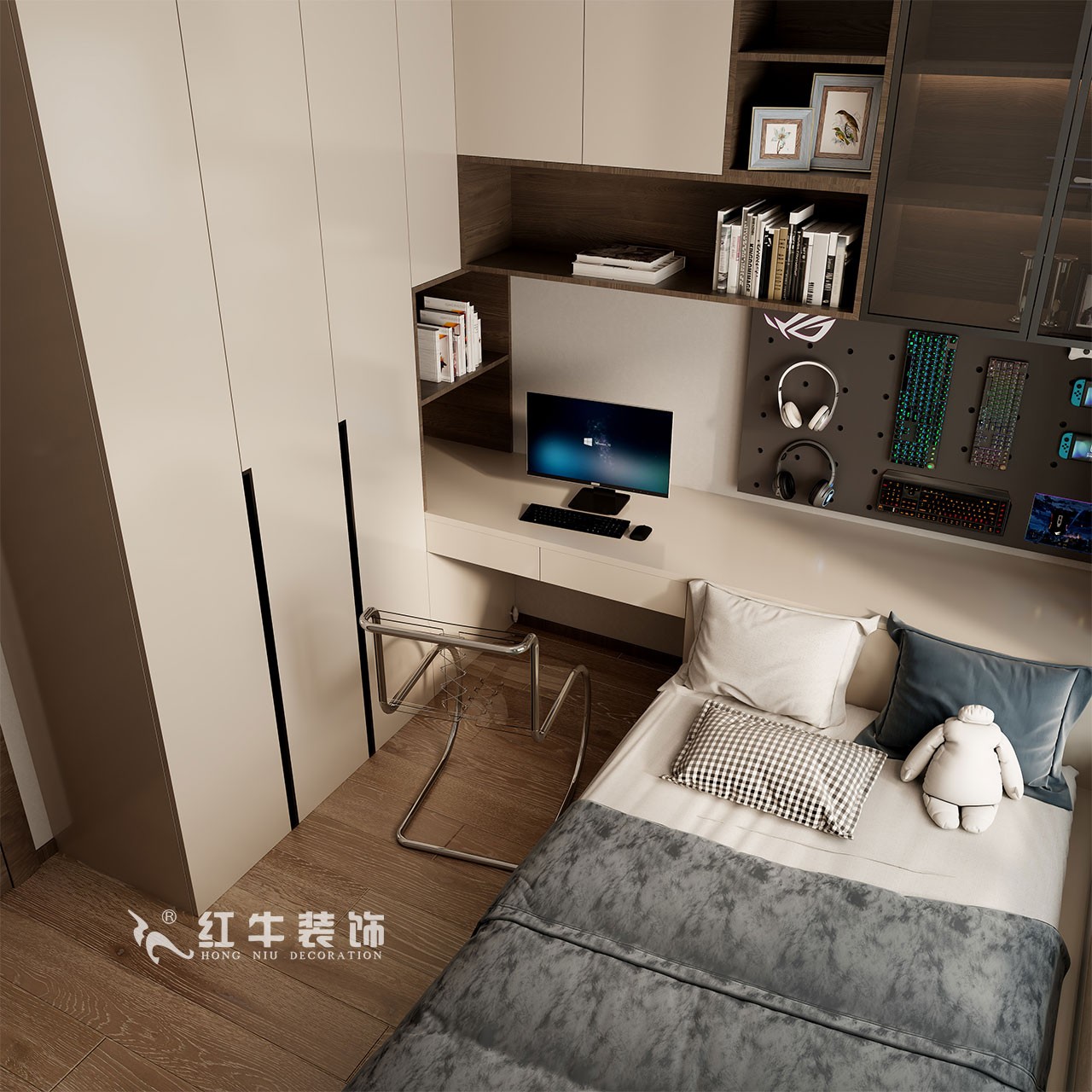 多功能房間,床頭延伸可作書(shū)桌、置物臺(tái)等,白色定制柜,開(kāi)放格、洞洞板滿足業(yè)主日常收納、儲(chǔ)物等需求。