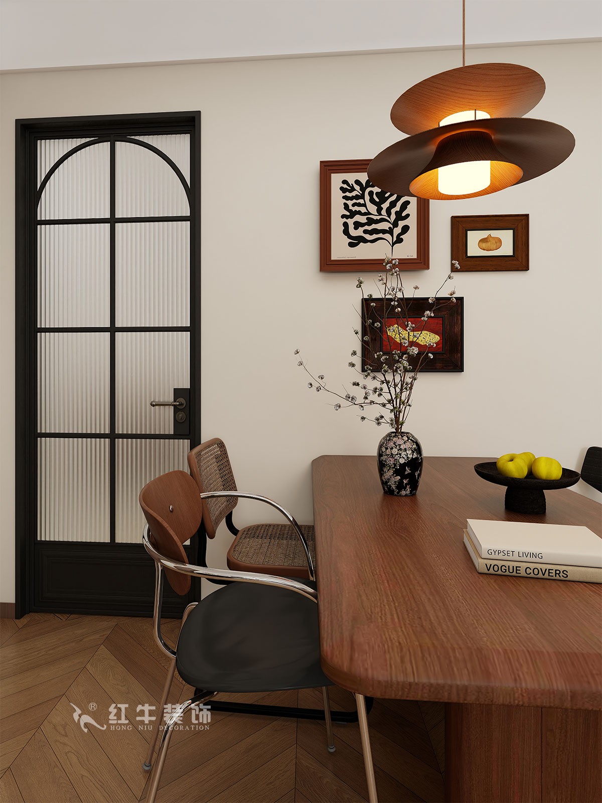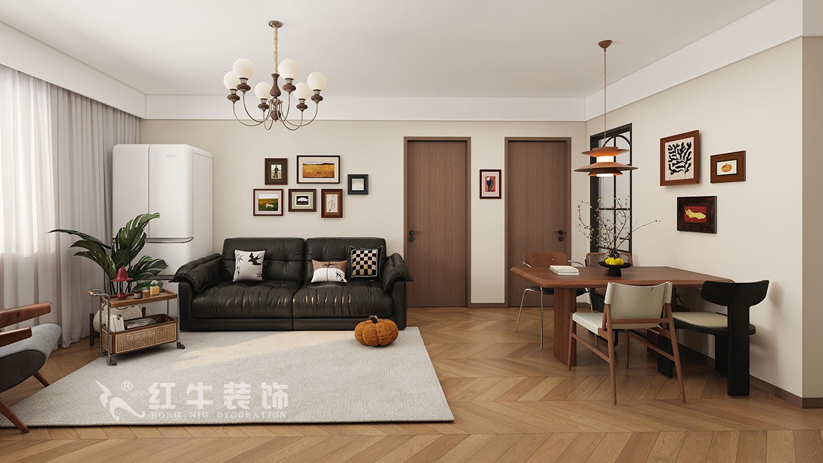 材質(zhì)選擇:地面通鋪人字拼木地板,墻面使用乳膠漆,選擇線條簡潔的中古家具,如沙發(fā)、茶幾、餐桌椅等,搭配復(fù)古燈具、裝飾畫和綠植,增添藝術(shù)氣息。
