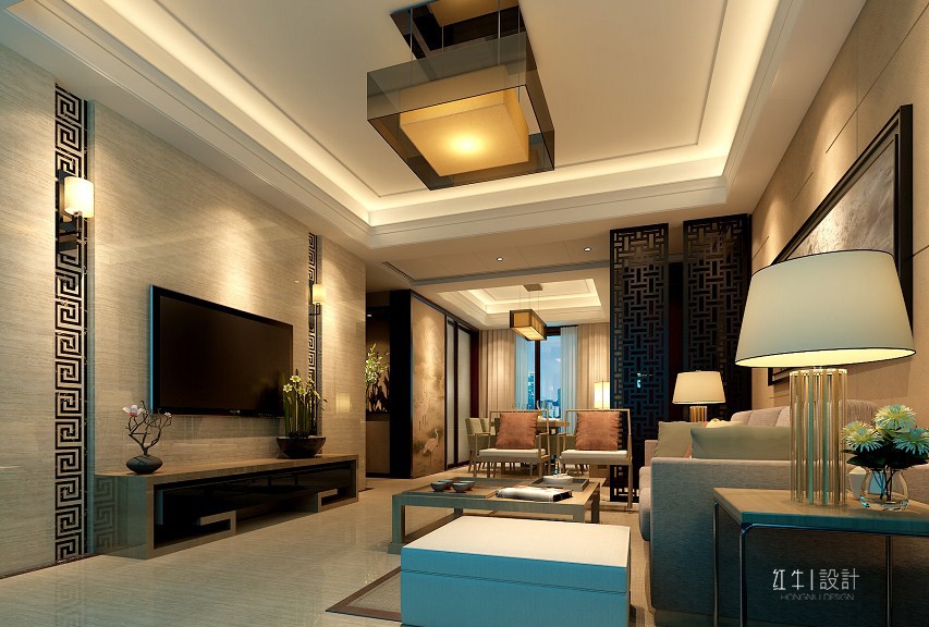 現(xiàn)代風(fēng)格的家具表明了整個空間的基調(diào),中式風(fēng)格的紋路組合使空間不至于太過呆板,添加了一絲俏皮的因素,偌大的花格燈成為視覺中的一大亮點(diǎn)。