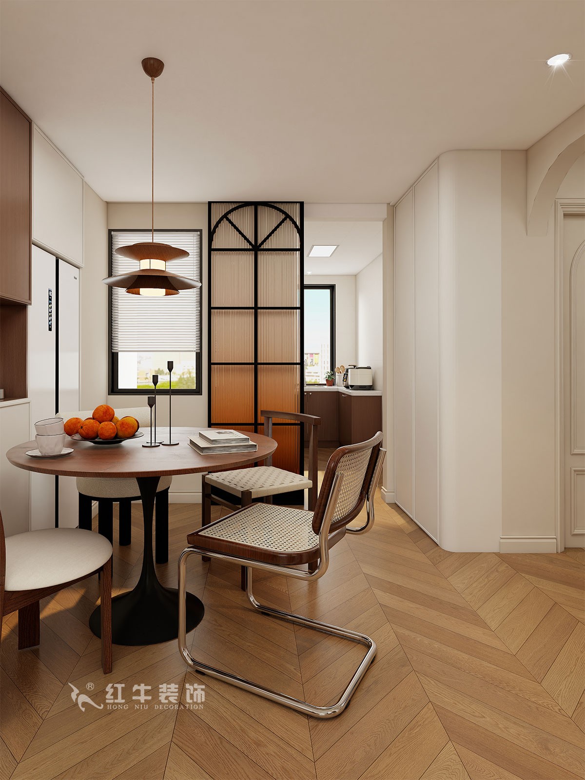 空間布局:開放式客餐廳通過拱形門洞劃分區(qū)域,增強空間層次感;鋼琴線作為視覺焦點,搭配復(fù)古線條與暖光照明,營造優(yōu)雅氛圍。