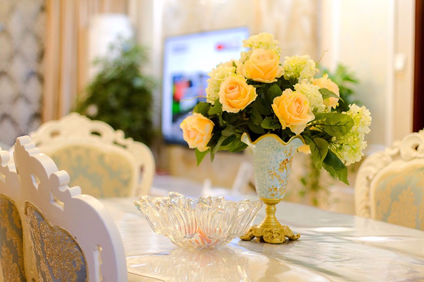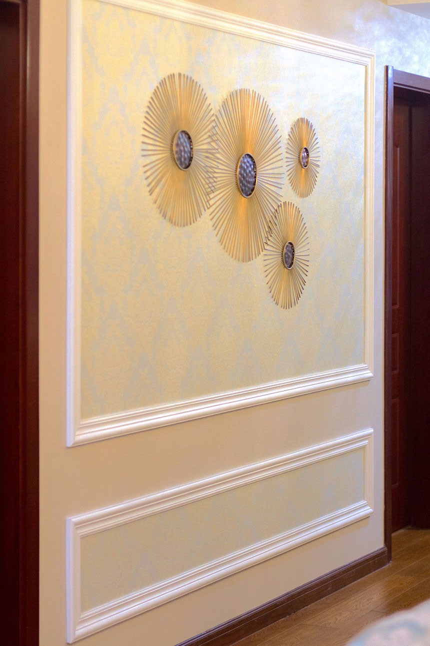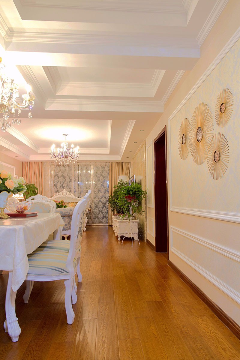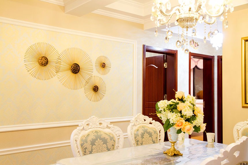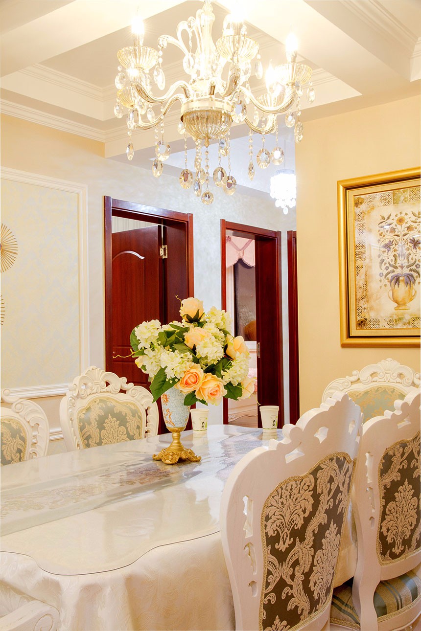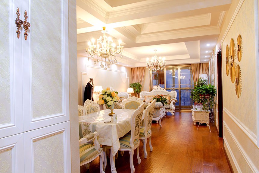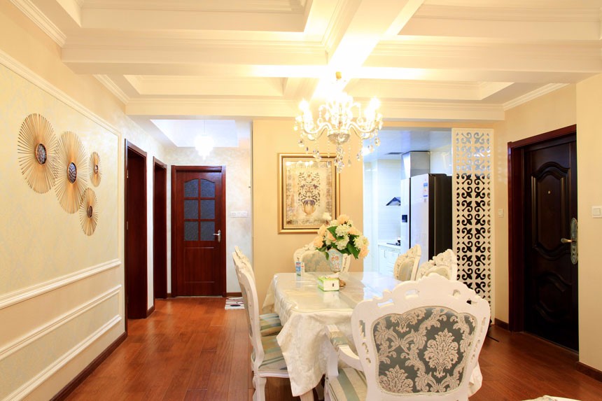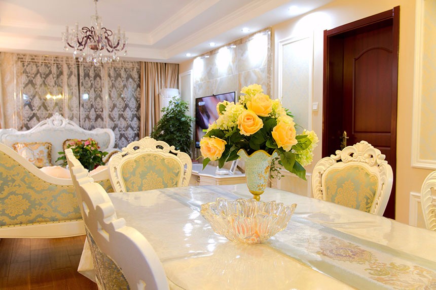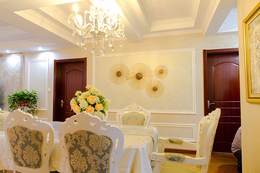 客餐廳采用線條,配以的石材點(diǎn)綴,拓寬客餐廳區(qū)域的空間感。墻面采用對(duì)稱的實(shí)木線條,與頂面的十字石膏線相呼應(yīng),不同材質(zhì)的組合營(yíng)造尊貴典雅的生活品質(zhì),細(xì)膩的詮釋了空間的浪漫魅力。