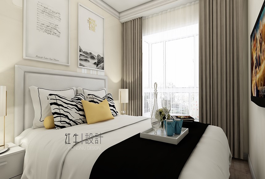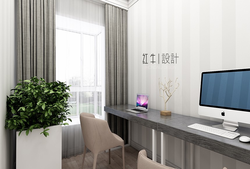 客餐廳色調清雅,休閑、隨性又不失精致,電視背景墻沒有過多的華麗修飾,給空間本身一個開拓、延展性,給居住者一個慵懶、明快的起居環(huán)境。主臥次臥,依靠家具本身的線條感,搭配寫實主義的裝飾畫,給人以休閑自在的視覺感受。書房是辦公空間,設計者在整面墻留白,搭配淺色條紋壁紙,給了本就不大的空間一個視覺的開放性,心情也自然就舒緩很多。
