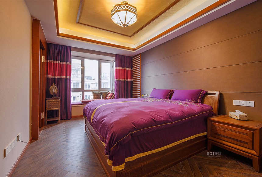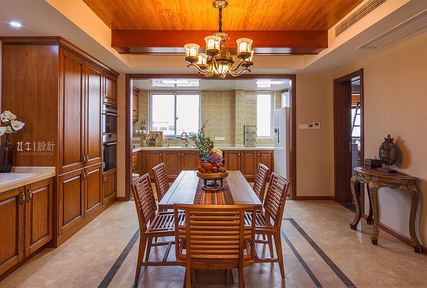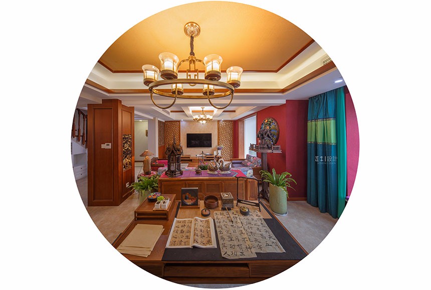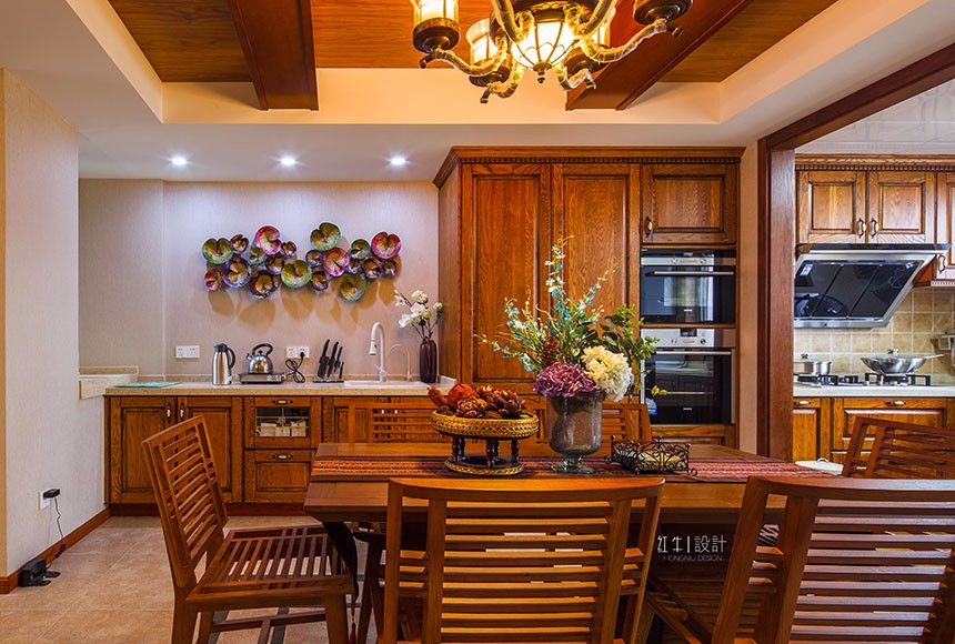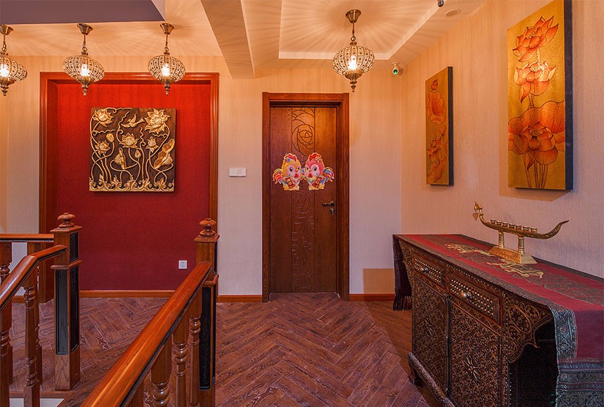 整個(gè)空間不難發(fā)現(xiàn)墻面上采用了很多的實(shí)木作為裝飾,電視背景墻兩個(gè)的實(shí)木雕花隔斷,配合象征吉祥的荷花圖案的壁紙,頂面的不同材質(zhì)的粱柱結(jié)合,實(shí)木的家具,使得家里透著沉穩(wěn),墻面采用了米灰色系的墻紙,作為家里大面的襯景,使得家里安靜溫馨。在南面的這個(gè)墻面采用了東亞南民族的紅色,一下把整個(gè)風(fēng)格的熱情帶動(dòng)了起來,用沖突的綠色窗簾,空間又提亮了很多。實(shí)木描金的雕刻,頂上的純銅的燈飾,使得家里沉穩(wěn)中透著貴氣。