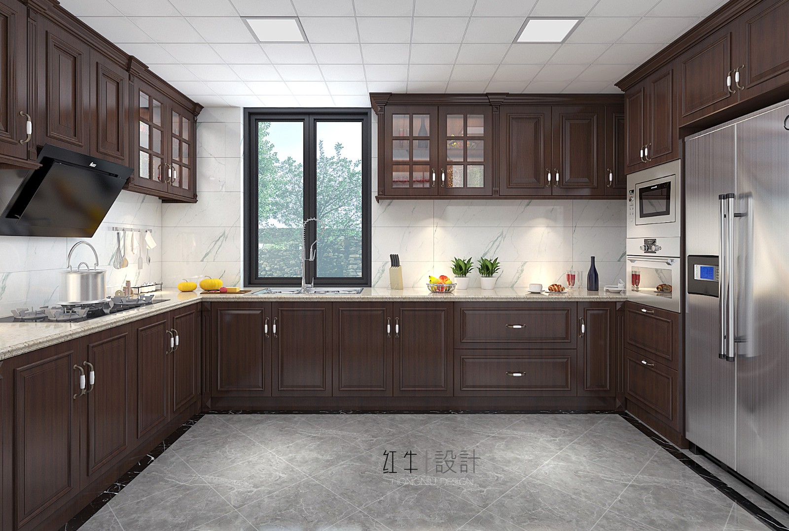 可以看出,廚房的面積很大,深沉的紅色板材將廚房營造地分外沉穩(wěn)低調,地面鋪上大塊的菱形地磚,簡單卻大氣。