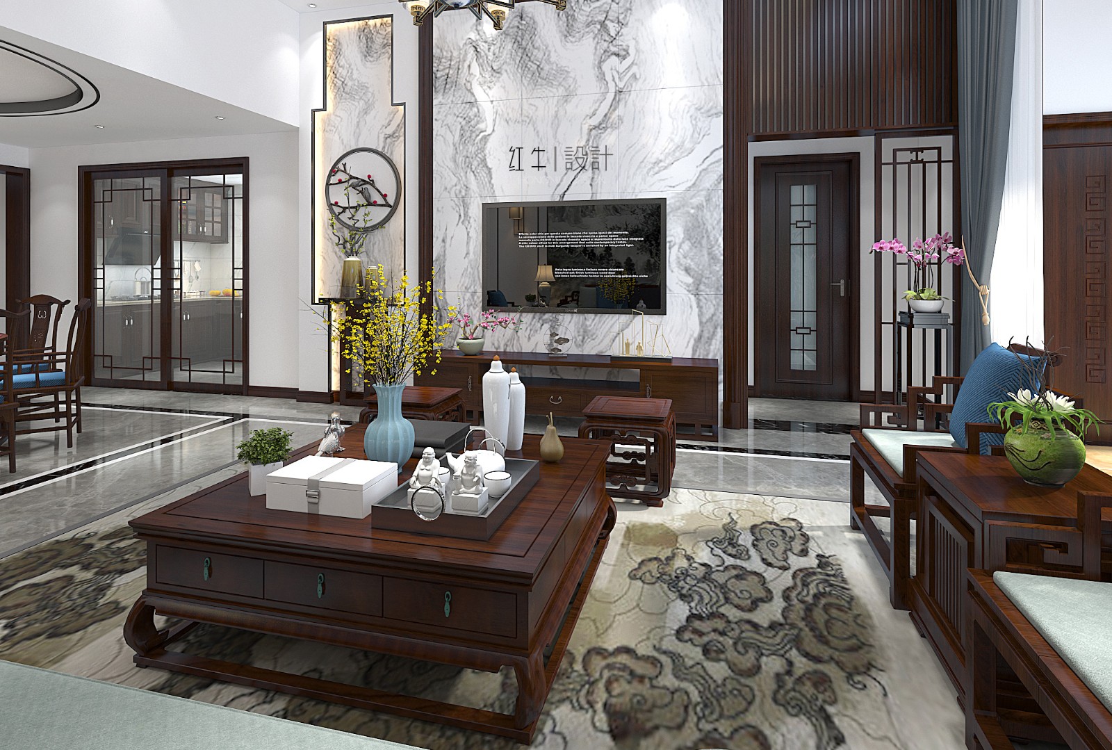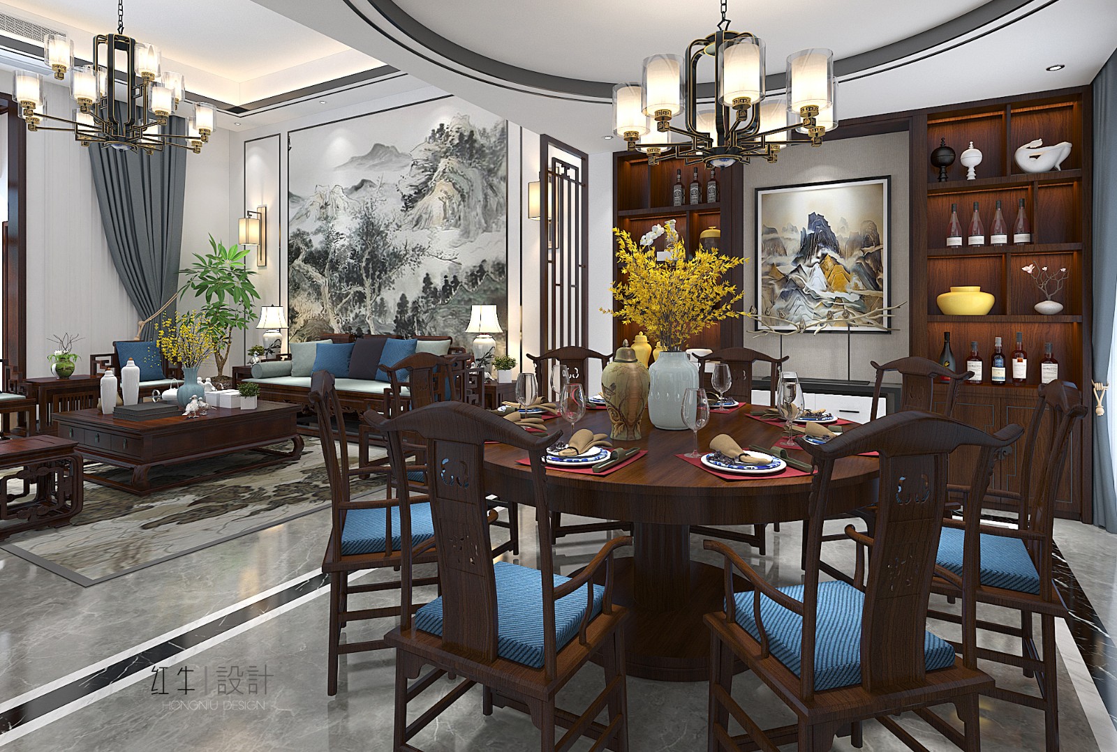 客廳整體陳設布局端莊、平穩(wěn),蘊含古典氣質。