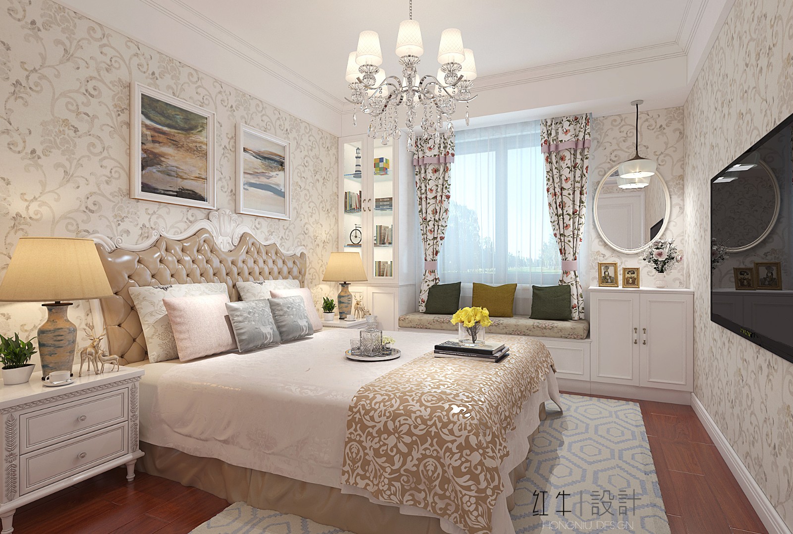 這間是女兒房,女孩一直向往飄窗和單獨的化妝區(qū)域,所以在靠窗位置設計一個裝飾飄窗和化妝一體的多功能柜。