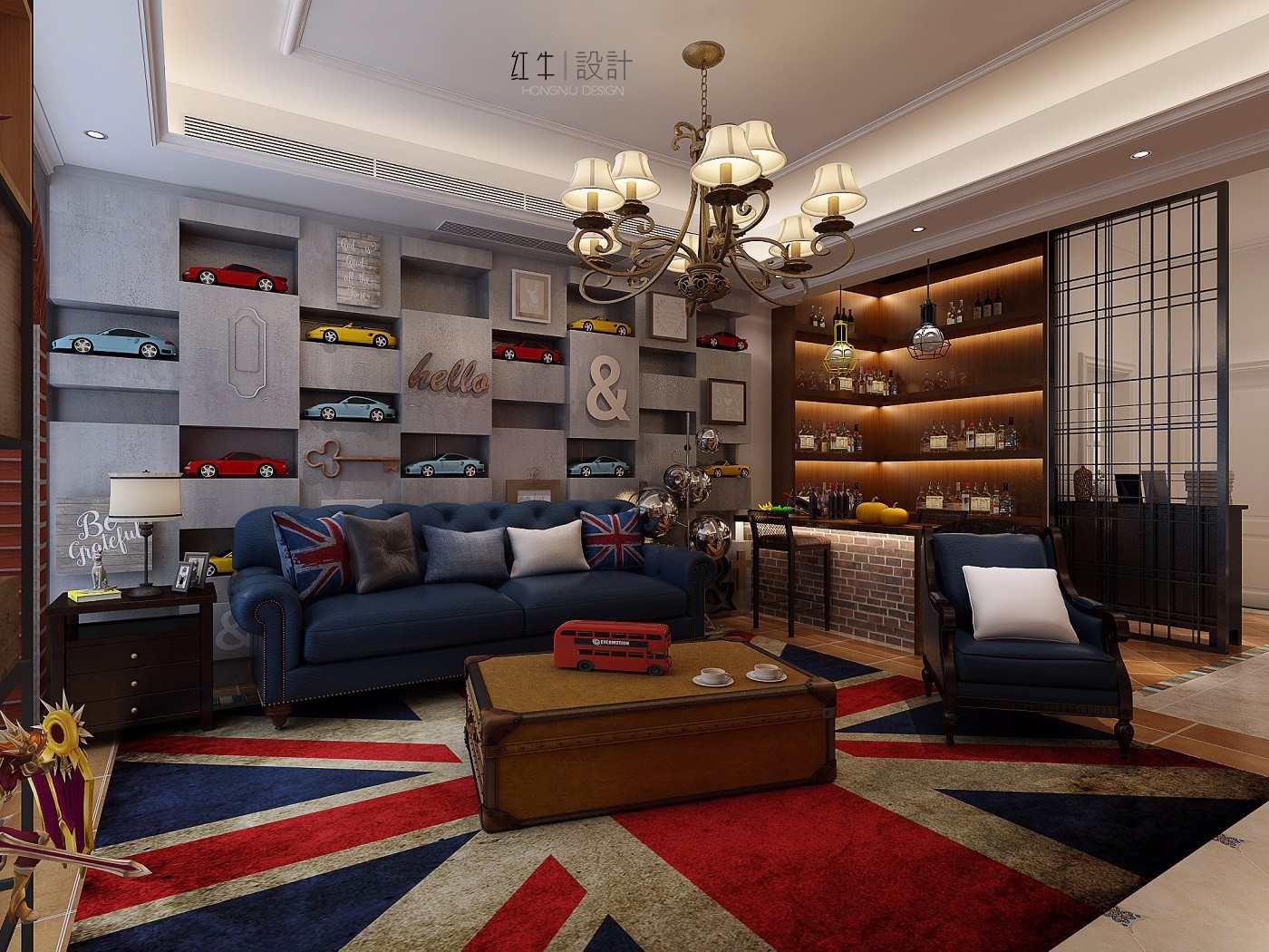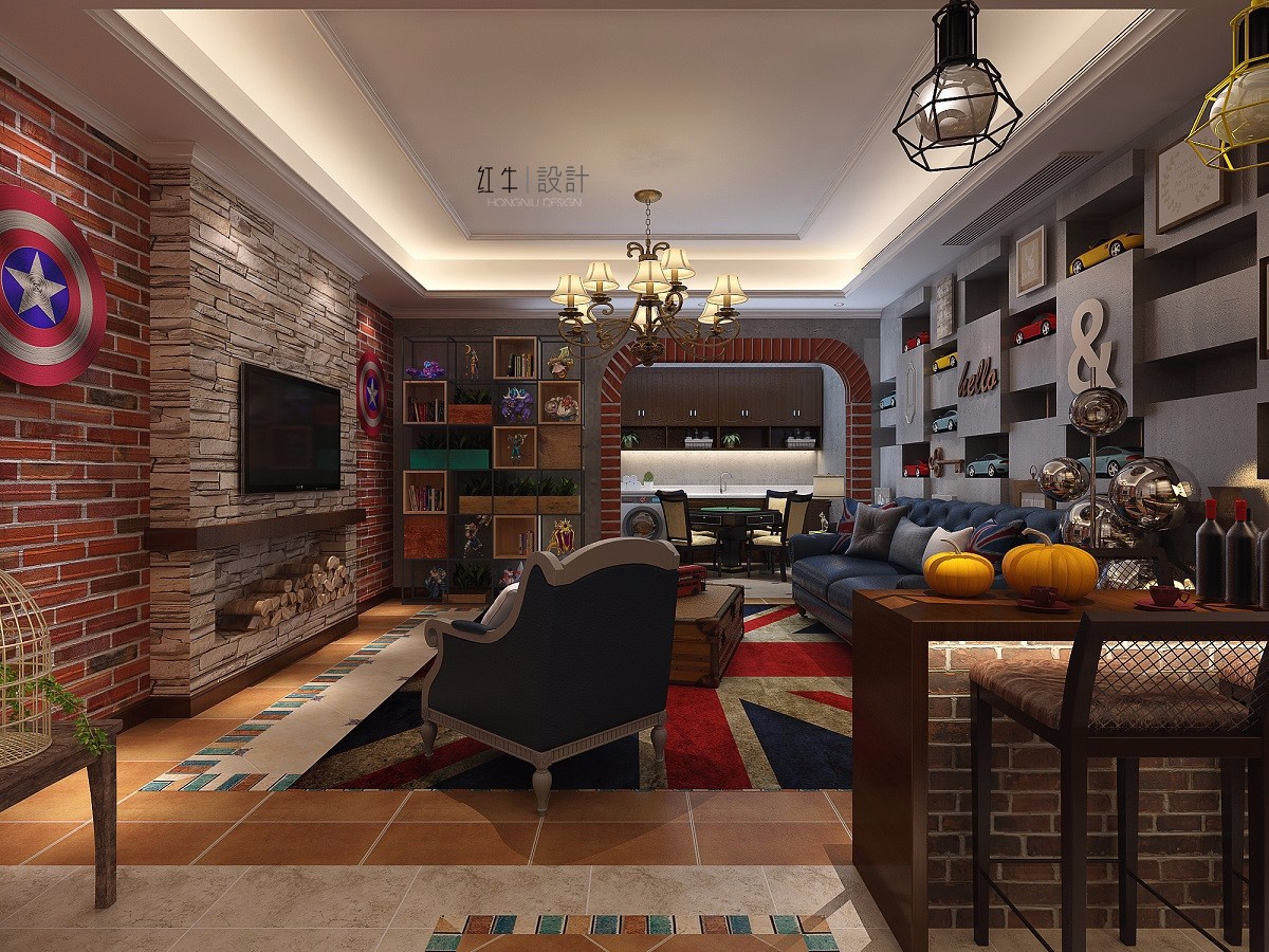 墻上的美隊盾牌,沙發(fā)背景墻上汽車模型,架子上的手辦都是年輕人的興趣所在;手提箱形狀的茶幾以及電視下面的柴火,都極具個性;英國國旗圖樣的地毯與沙發(fā)上同圖案的抱枕相呼應,充滿時尚感。這一切無不顯示出這是年輕人的休閑場所。