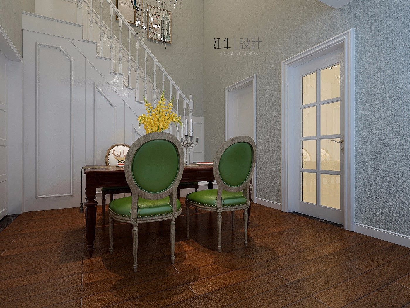 深色地板搭配淺色墻壁,綠色椅子在其中很是亮眼,而當綠色遇上鮮嫩的黃色裝飾花時,一種清爽、生動的感覺便油然而生。