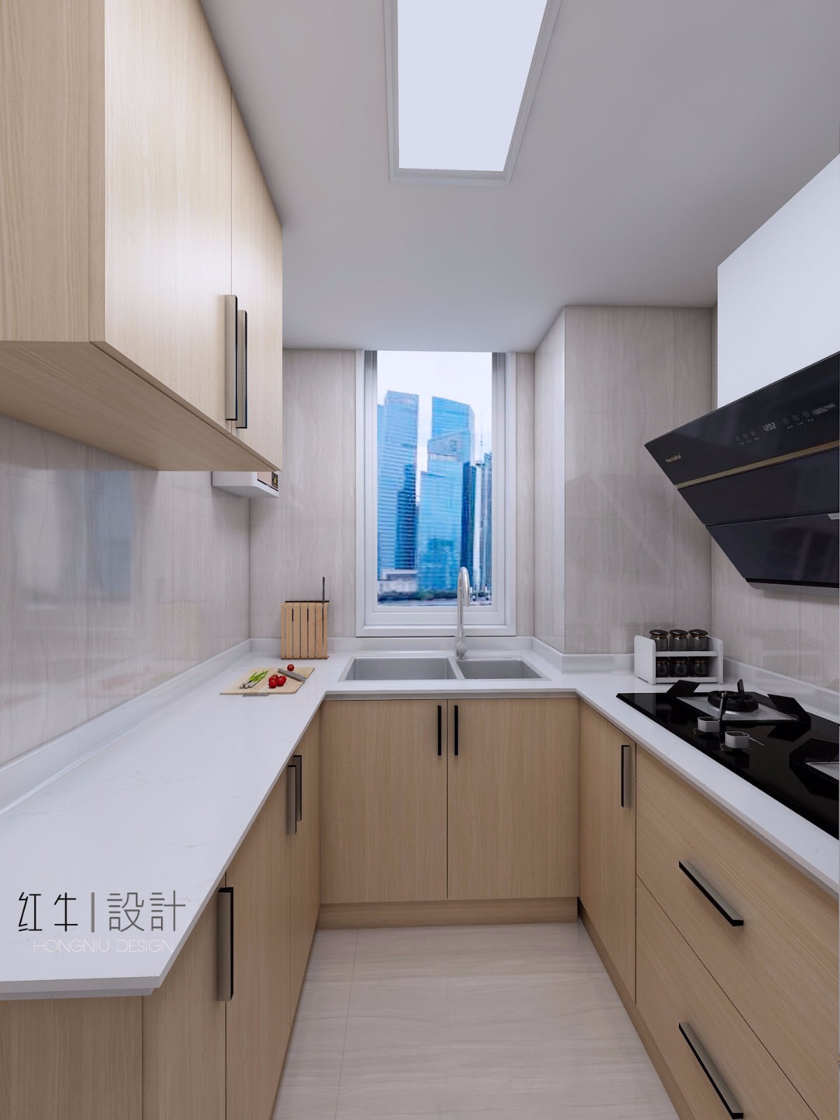 木色櫥柜,營造出自然溫暖的感覺,白色的廚房臺面,使得廚房充滿潔凈感。