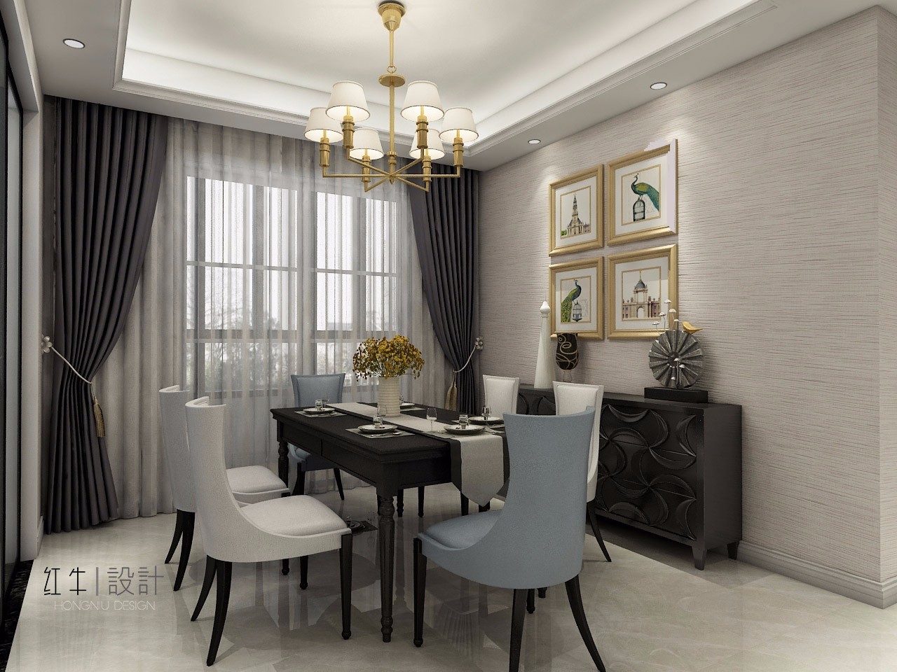 餐廳硬裝部分的裝飾主要采用了素色的墻紙和護(hù)墻板,線條相互搭配,營(yíng)造簡(jiǎn)潔大氣的美式氛圍。