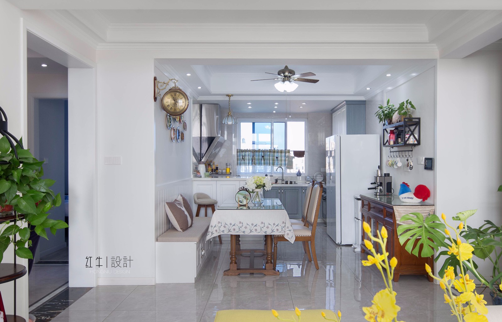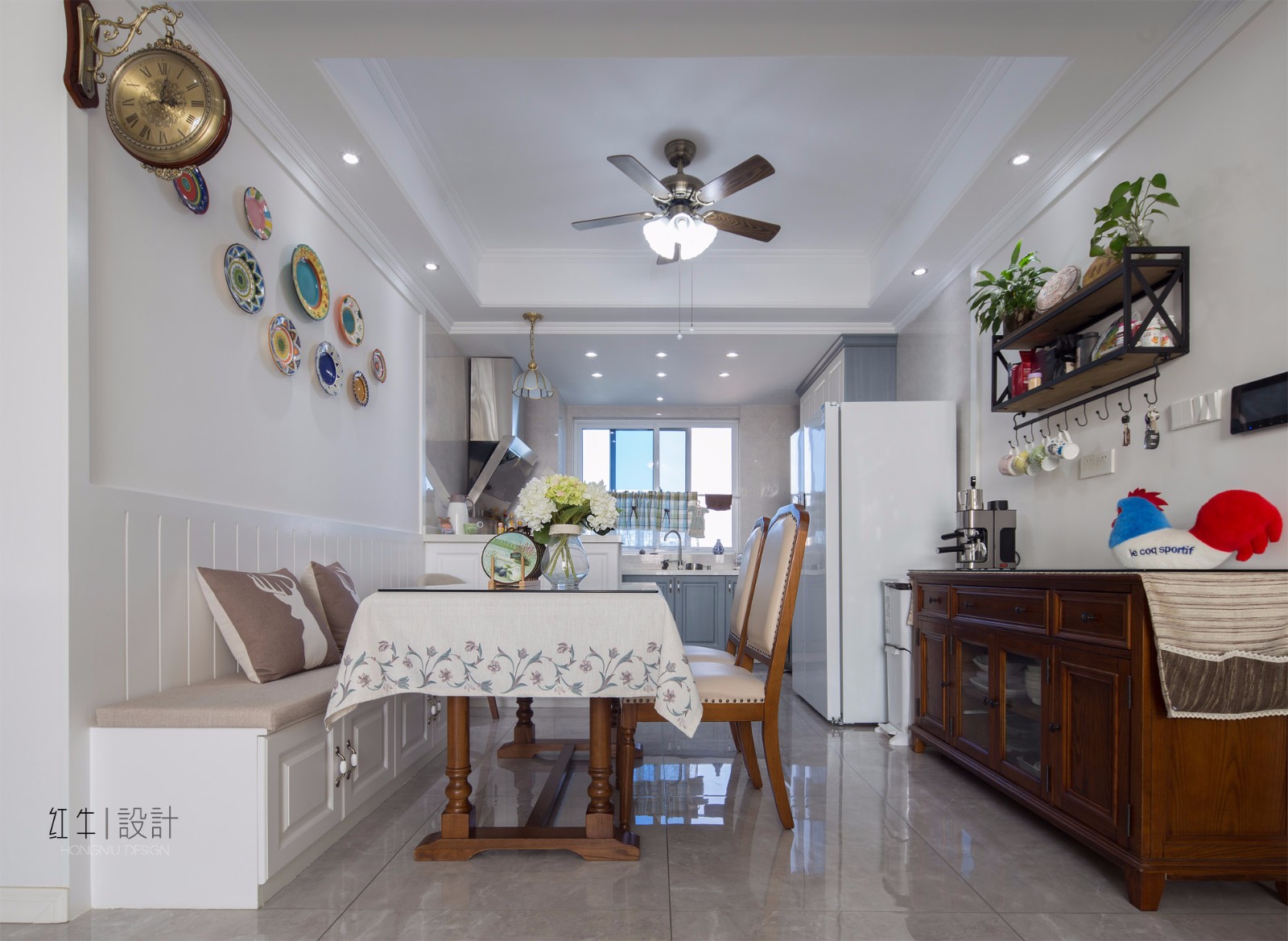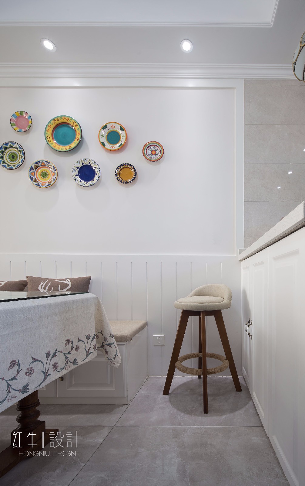 餐廳設(shè)計(jì)了卡座,不僅可以當(dāng)做餐椅使用,還能提供一些儲(chǔ)物空間,搭配白色墻裙,清新典雅。