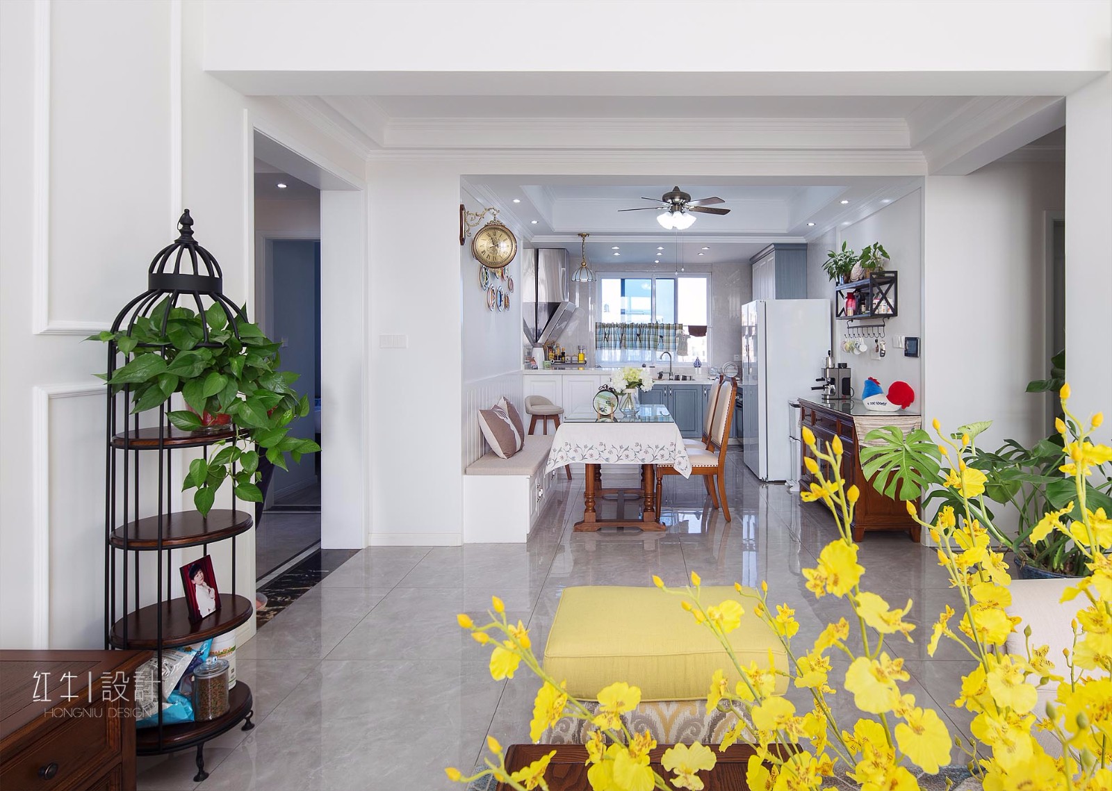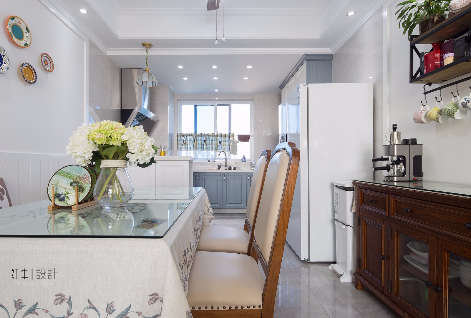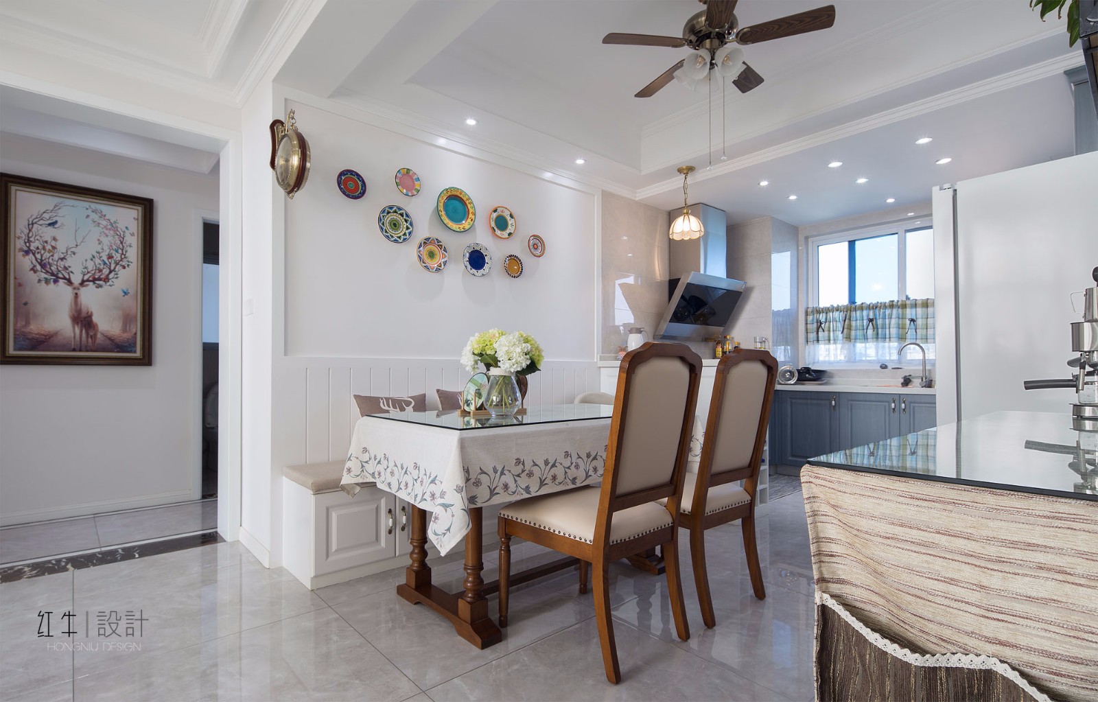 餐廳設(shè)計(jì)了卡座,不僅可以當(dāng)做餐椅使用,還能提供一些儲(chǔ)物空間,搭配白色墻裙,清新典雅。