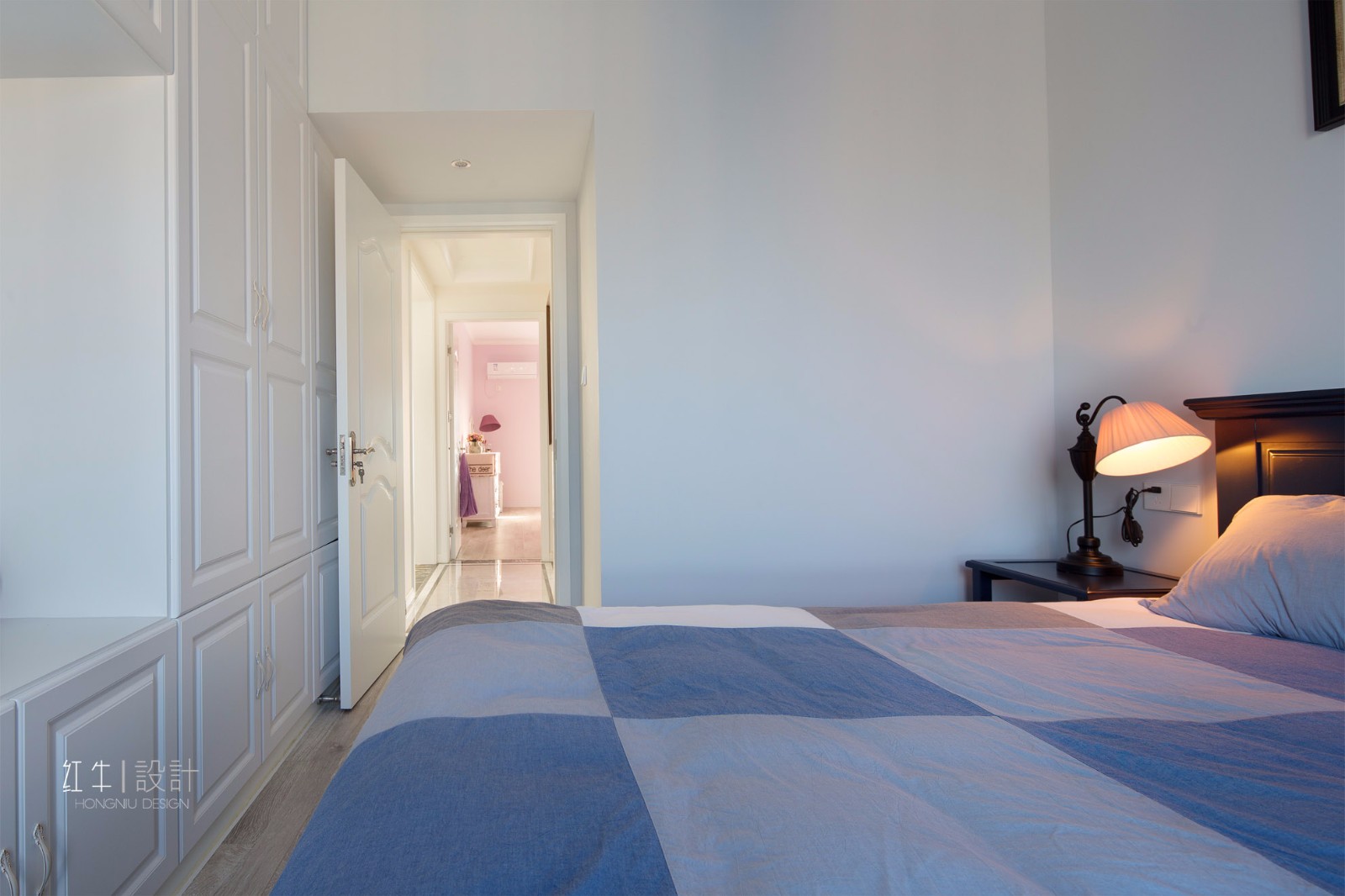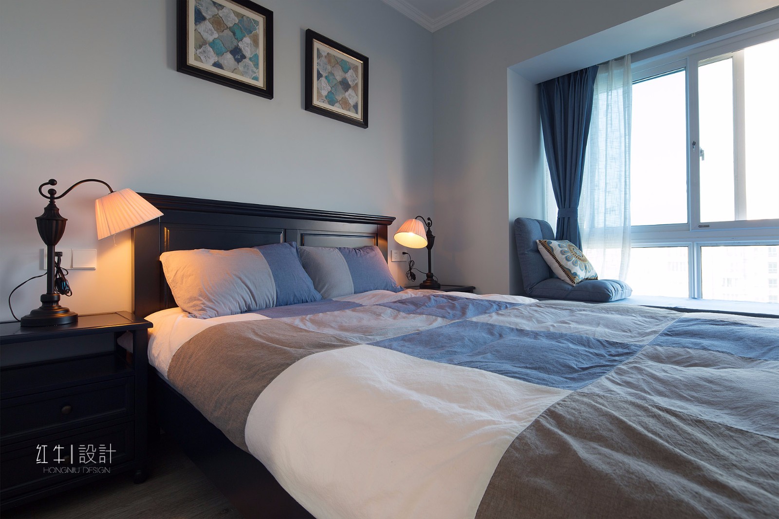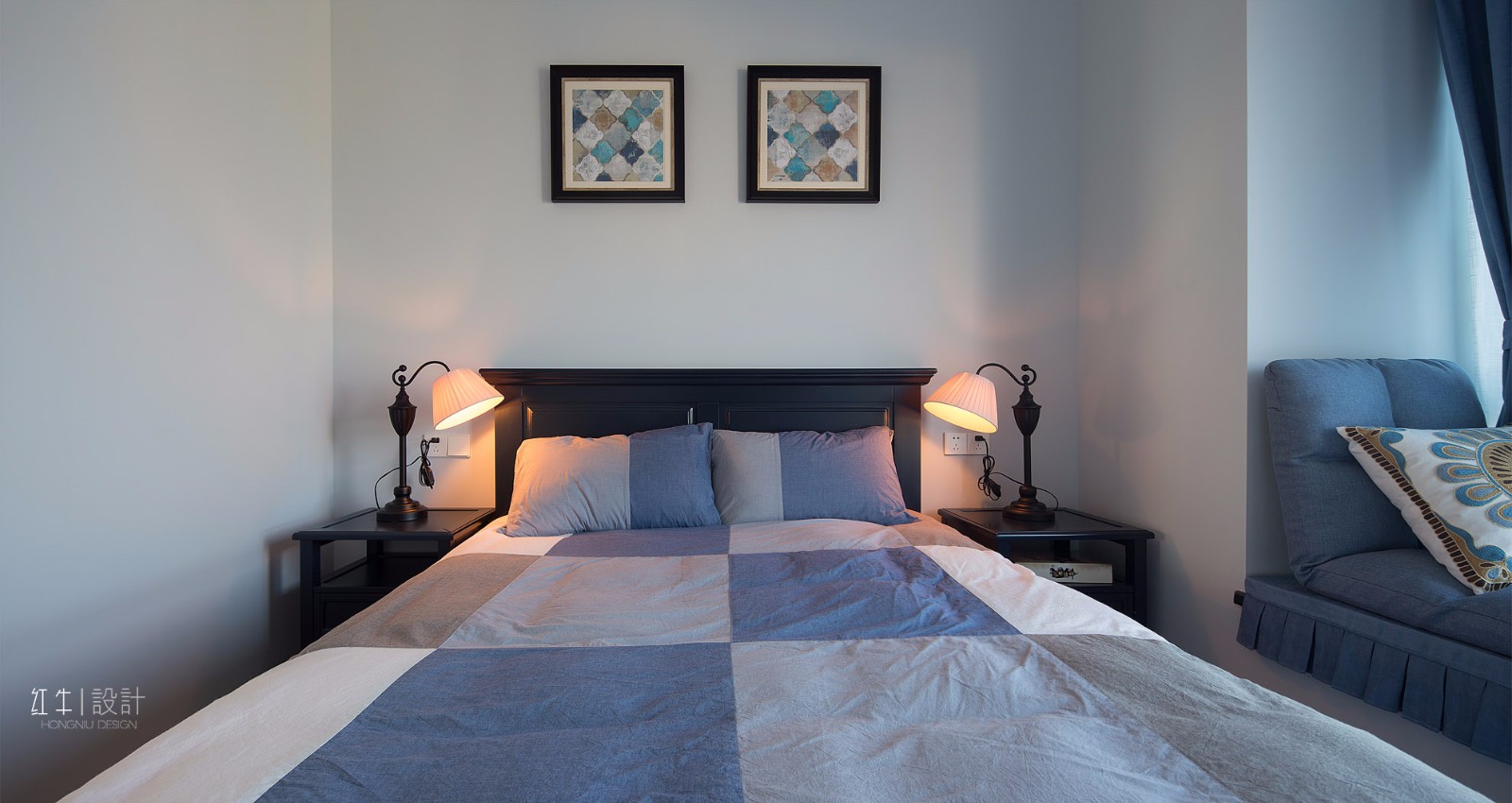 次臥顯得沉穩(wěn)低調(diào),對(duì)稱擺放的床頭柜、臺(tái)燈、裝飾畫,顯得溫馨融洽。