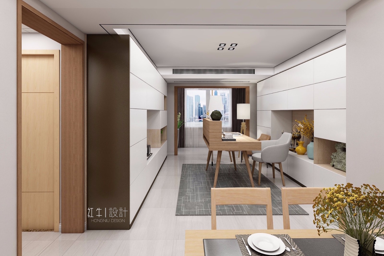 客餐廳色調(diào)清雅,休閑、隨性、精致,電視背景墻距離沙發(fā)過遠(yuǎn),中隔的半墻在分區(qū)后巧妙騰出一個半開放的書房空間。設(shè)計者在整面墻留白,像一條小路通向遠(yuǎn)方,給了本就不大的空間一個視覺的開放性,心情也自然就舒緩很多。