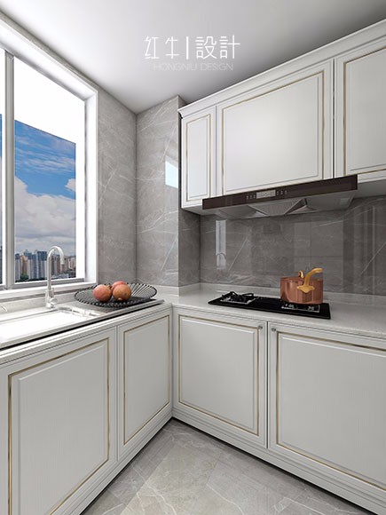 廚房以白色為基調(diào),給人一種清潔感,加上灰色的墻磚,顯得更加時髦。