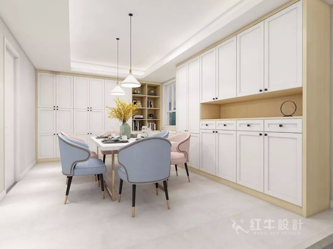 而色彩方面,設(shè)計師選擇將馬卡龍色融進北歐風的裝飾當中,柔和的色調(diào)跟北歐風自帶的清新風格不謀而合,給人一種歸家的溫暖感。