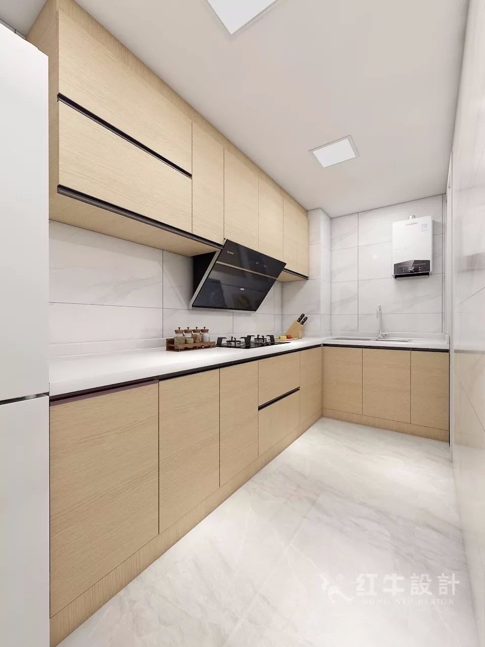 廚房呈L形布局,淺色的地磚、墻磚搭配木色櫥柜,有一種回歸自然的感覺。由廚房可以進入衛(wèi)生間的后方的盥洗室,進行一些物品的清潔。