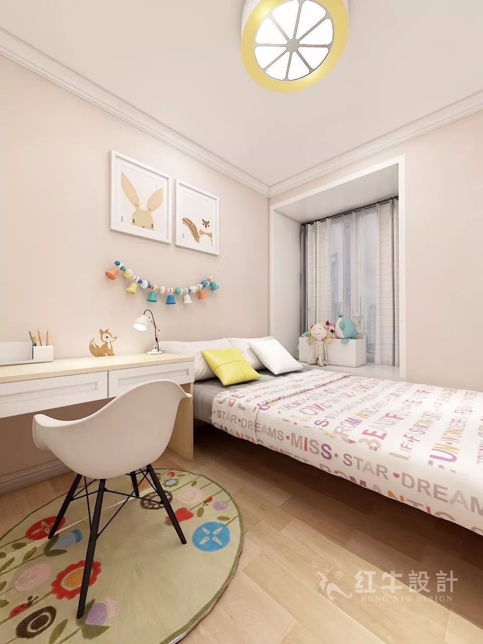 兒童房色彩和諧統(tǒng)一,很有童趣。床頭擺上書桌椅,就是一處很好的學習區(qū),圓形地毯有其獨到的韻味,配合單椅使用,起到一個很好的點綴作用。