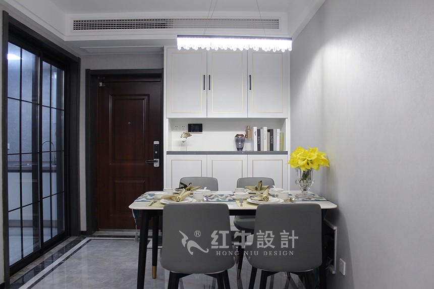 玄關(guān)柜能夠帶來不少收納空間,中空部分放些裝飾品,顯得相當(dāng)美觀。餐廳區(qū)風(fēng)格素雅,餐桌人性化的圓角處理能夠呵護(hù)家人安全。