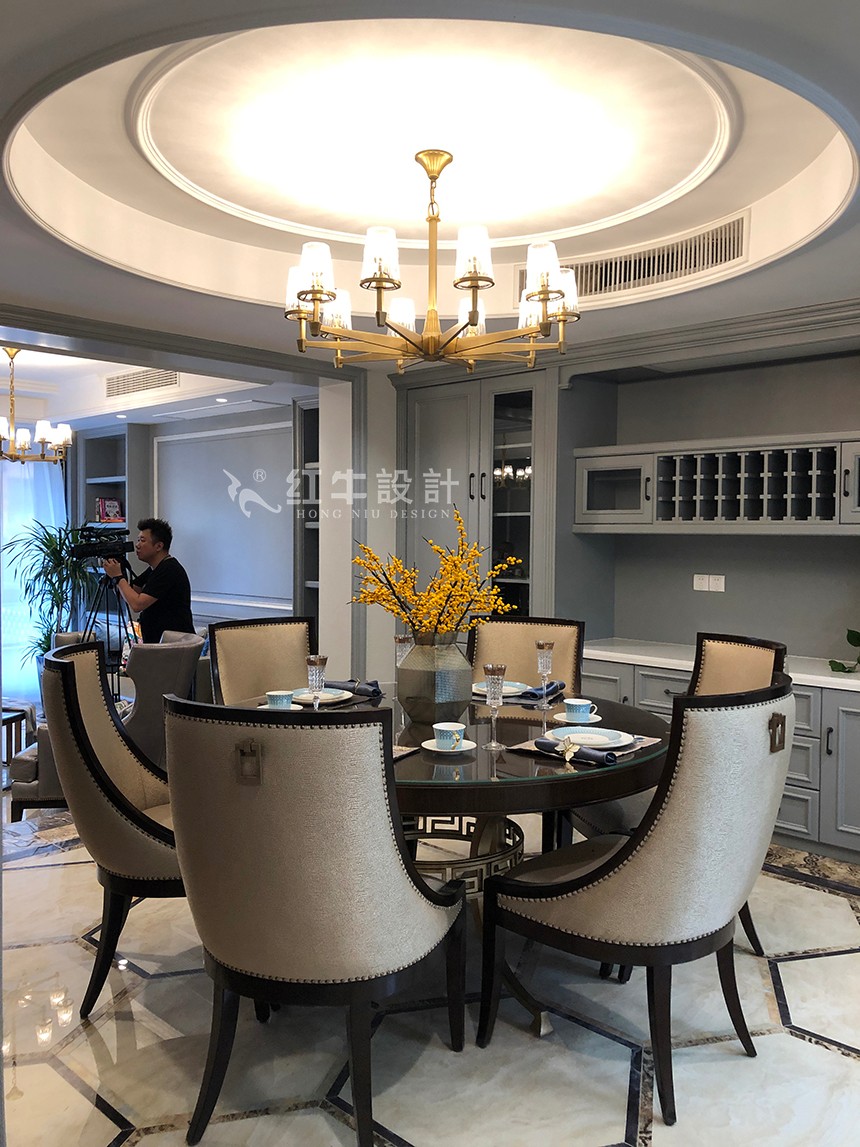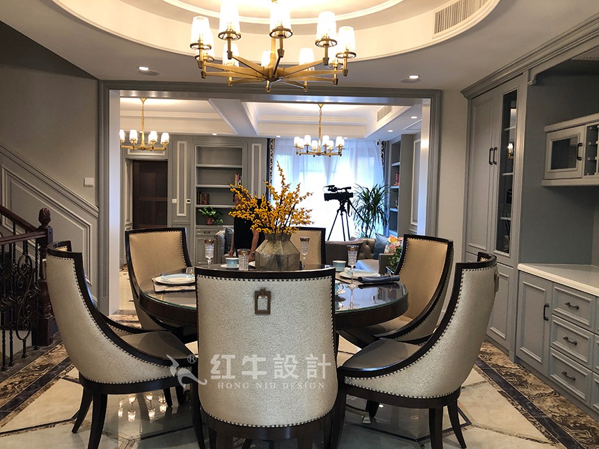 在整個空間的立面效果上,實(shí)用和美觀相結(jié)合。設(shè)計(jì)了很多的柜子,包括客廳的裝飾柜和餐廳的餐邊柜,不但可以更好地體現(xiàn)出美式風(fēng)格,同時(shí)也把空間利用得恰到好處。