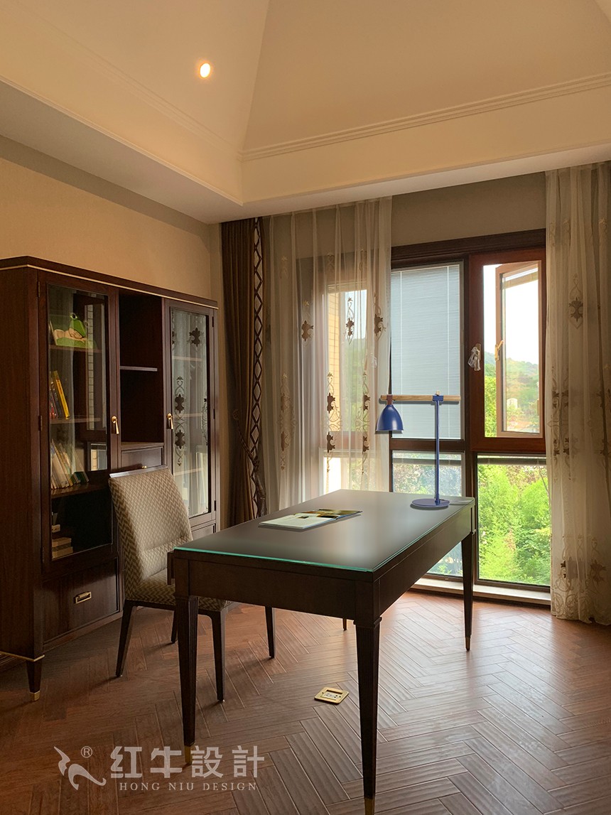 書房空間寬闊,家具樣式簡潔,物品適量,使書房倍顯大氣。玻璃書柜貴氣有質(zhì)感,還可以防塵保護(hù)書籍。雙層窗簾的搭配能夠營造出朦朧的美感。