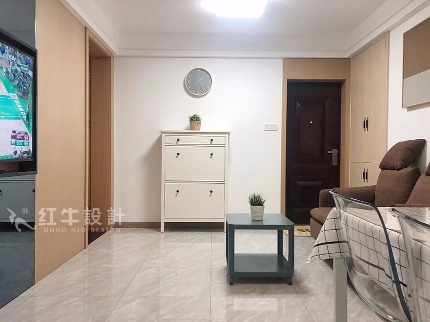 一進門,映入眼簾的就是客餐廳。倚墻而立的白色玄關(guān)柜,搭配上懸掛的鬧鐘,讓這面墻不再單調(diào)。