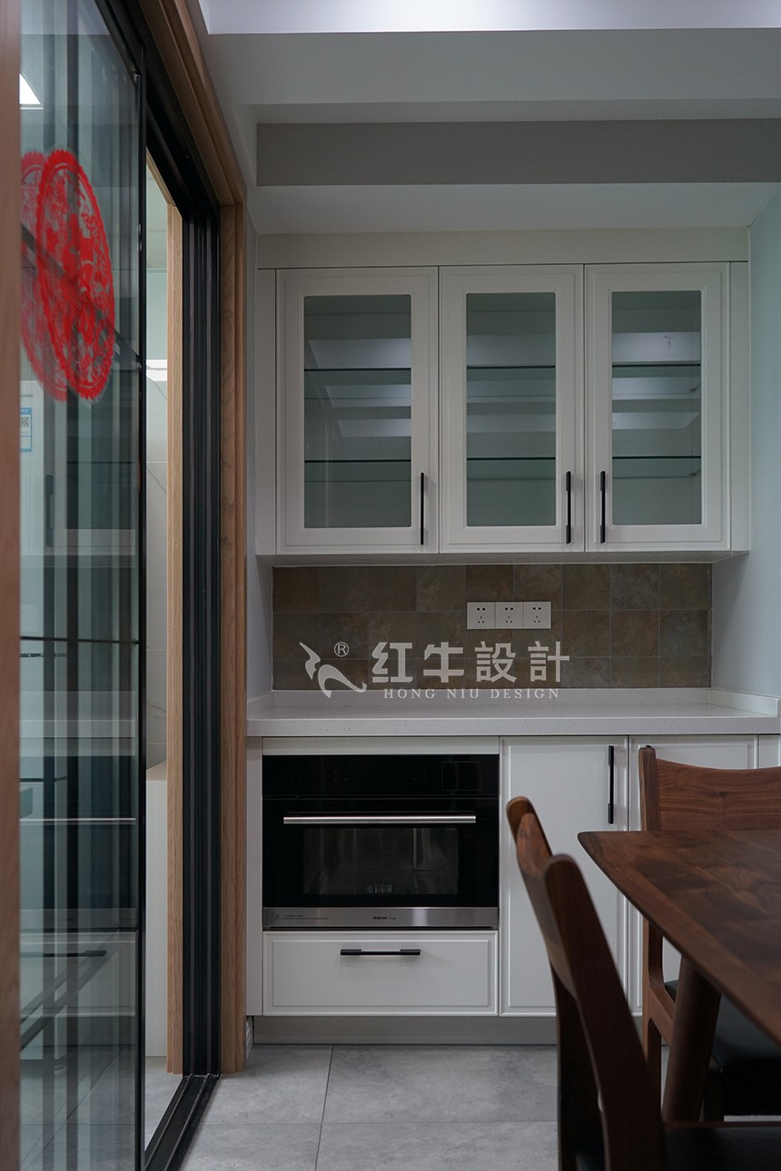 操作區(qū)擁有嵌入式廚電設(shè)計,看起來非常整潔利落。剔透美觀的玻璃柜門,和傳統(tǒng)的木質(zhì)門扇相比的話,顯得更有活力。此外,操作區(qū)還為餐廳增加了很多收納空間。