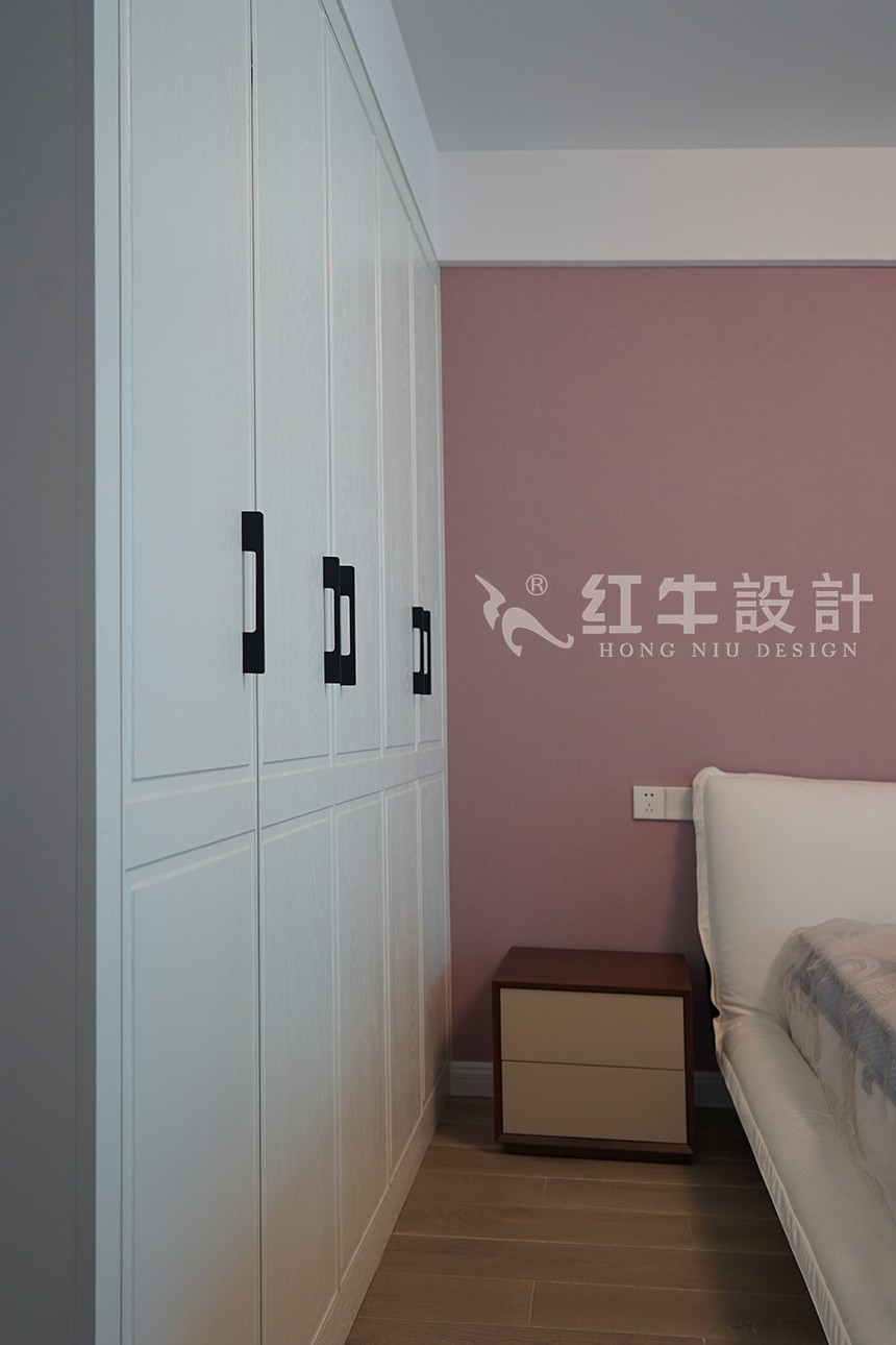 粉色的背景墻,使人進入臥室以后就能感受到溫暖之意,搭配白色的柜子,呈現(xiàn)出一種浪漫情調(diào)。與木色地板相結(jié)合,讓空間層次感更豐富。