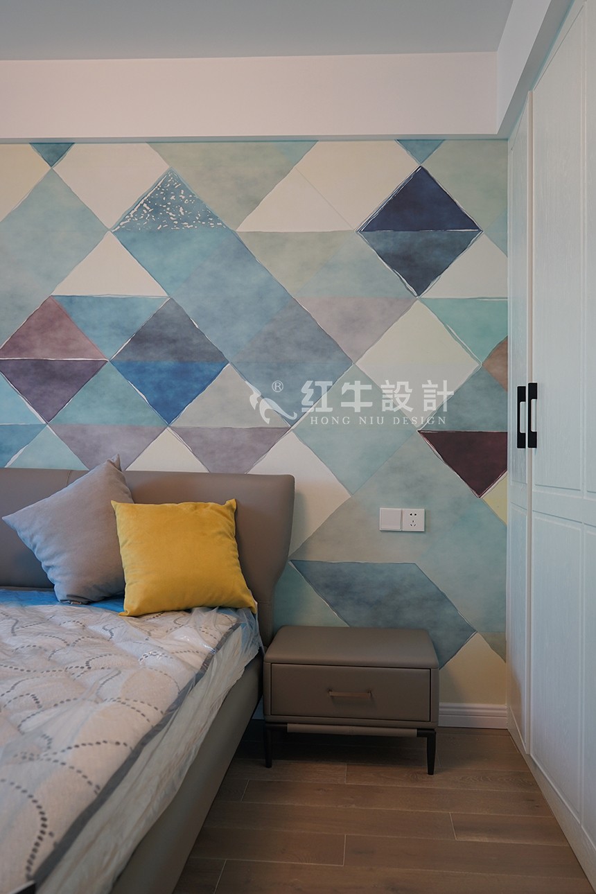 墻面沒有做過多的造型,而是使用了不同的色塊進行拼接,帶來強烈的視覺沖擊感,是十分大膽的設(shè)計,產(chǎn)生了別樣的動感之美。