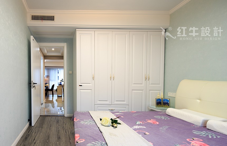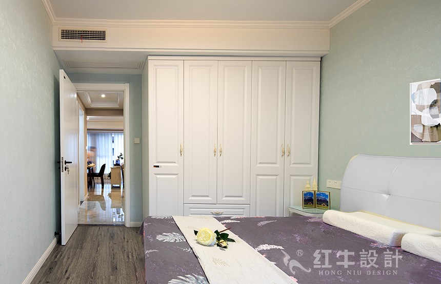 淡青色的墻壁,搭配白色的柜子給人一種清新舒適的視覺感。床的外觀簡單大方,邊邊角角沒有鋒利的棱角,使得臥室顯得溫暖而又柔軟。